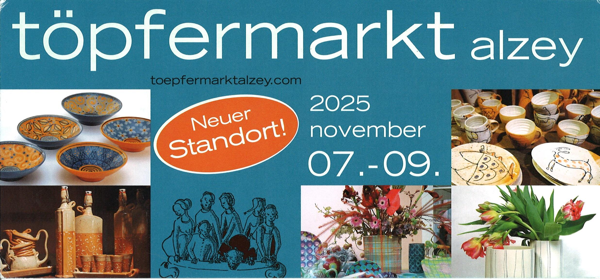 Vom 7. bis 9. November treffen sich wieder Keramiker aus dem gesamten Bundesgebiet um beim Alzeyer Töpfermarkt ihre Werke zu präsentieren. Zahlreiche Meisterwerkstätten, eingeladen vom „Freundeskreis Töpfermarkt Alzey“, bieten Gebrauchsgeschirr, handwerkliche Kleinserien und Unikate zum Verkauf an.