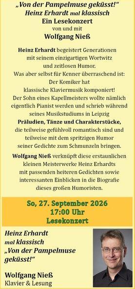 Heinz Erhardt begeistert Generationen mit seinem einzigartigen Wortwitz und zeitlosem Humor. Was aber selbst für Kenner überraschend ist: Der Komiker hat klassische Klaviermusik komponiert! Der Sohn eines Kapellmeisters wollte nämlich eigentlich Pianist werden und schrieb während seines Musikstudiums in Leipzig Präludien, Tänze und Charakterstücke, die teilweise gefühlvoll romantisch sind und teilweise mit dem spritzigen Humor seiner Gedichte zum Schmunzeln bringen.