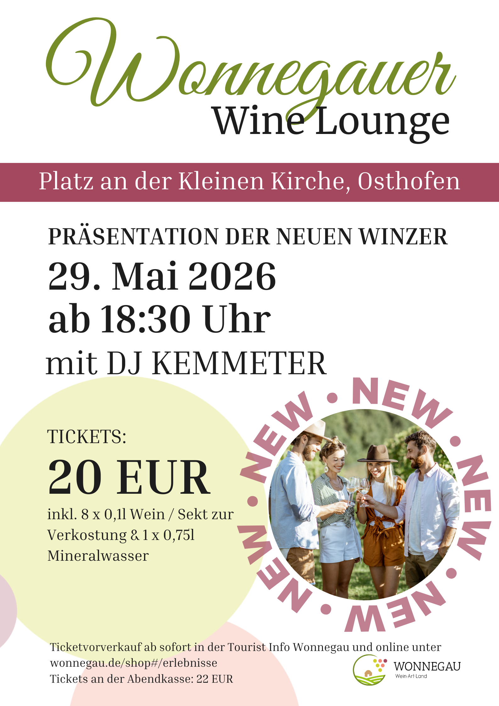 Die Wonnegauer Wine Lounge lädt am 29. Mai 2026 ab 18:30 Uhr auf den Platz an der Kleinen Kirche in Osthofen ein. Freuen Sie sich auf die Präsentation der neuen Winzer in stimmungsvoller Atmosphäre. Für 20 Euro im Vorverkauf genießen Sie acht Wein- und Sektproben à 0,1 l sowie eine Flasche Mineralwasser (0,75 l). DJ KEMMETER sorgt für die passende musikalische Begleitung und einen entspannten Start ins Wochenende. Tickets sind ab sofort in der Tourist Info Wonnegau und online erhältlich. Abendkasse: 22 Euro.