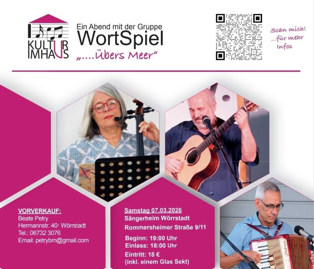 Die rheinhessische Gruppe WortSpiel lädt mit ihrem neuen Programm „Übers Meer“ zu einer musikalisch-literarischen Reise ein. Lieder von Rio Reiser und Wenzel treffen auf Texte von Ringelnatz und Baudelaire – mal humorvoll, mal melancholisch, immer berührend. Ein Abend über Sehnsucht, Kraft und die Magie des Meeres. Ein Abend für alle Sinne – mit Elisabeth Verhoeven (Sprecherin und Moderatorin bei SWR und WDR) sowie den Musikern Peter Holdenried, Hansi Lawall und Christian Hoch.