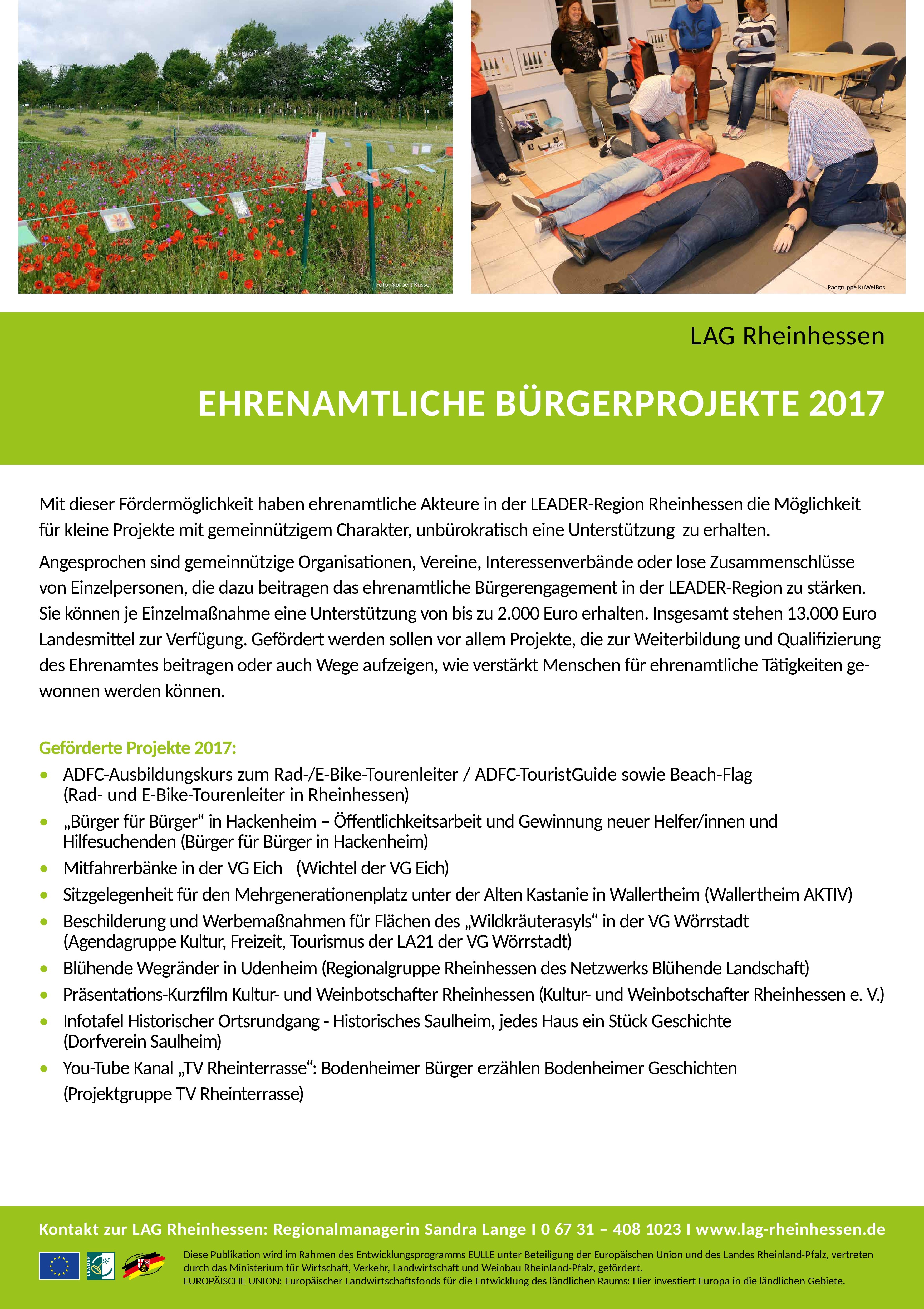 Die Ehrenamtlichen Bürgerprojekte in der LEADER-Region Rheinhessen wurden gefördert im Rahmen des Entwicklungsprogramms EULLE unter Beteiligung der Europäischen Union und des Landes Rheinland-Pfalz, vertreten durch das Ministerium für Wirtschaft, Verkehr, Landwirtschaft und Weinbau Rheinland-Pfalz.