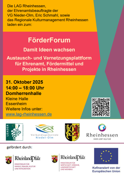 Am 31. Oktober 2025 lädt die LAG Rheinhessen gemeinsam mit dem Ehrenamtsbeauftragten der Verbandsgemeinde Nieder-Olm, Eric Schmahl, und dem Regionalen Kulturmanagement Rheinhessen zum FörderForum unter dem Titel „Damit Ideen wachsen“ ein. Die Veranstaltung findet von 14:00 bis 18:00 Uhr in der kleinen Halle der Domherrnhalle in Essenheim statt.