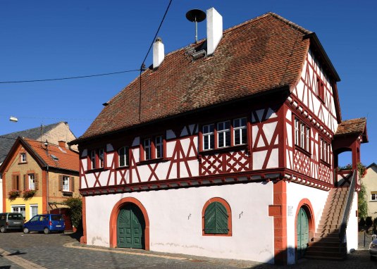 Probably built in the 16th century, the town hall still impresses with its half-timbered upper storey. It owes its salvation to an expert opinion from 1903, in which the historic town hall was already classified as very interesting in terms of art history. The town hall square serves as a venue for events throughout the year, and every year in August the traditional Weinbergshäuschenwanderung invites visitors to socialise. This location is part of an audiovisual route and offers the possibility to watch/listen to additional content on Youtube https://www.youtube.com/watch?v=cdAE6oSGHCIThe audiovisual content of this item was created by a project of the LAG Rhein-Haardt and was funded within the framework of the EULLE development programme with the participation of the European Union and the State of Rhineland-Palatinate, represented by the Ministry of Economics, Transport, Agriculture and Viticulture of Rhineland-Palatinate https://www.leader-rhein-haardt.de/