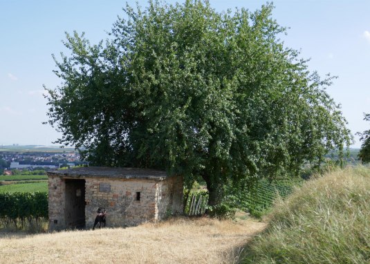 On the day of the great hailstorm (July 28, 1985), the vines in this vineyard were spared. Winemaker Mayer had provided them with plastic protection against rabbit damage, and thus the hail bounced off.
