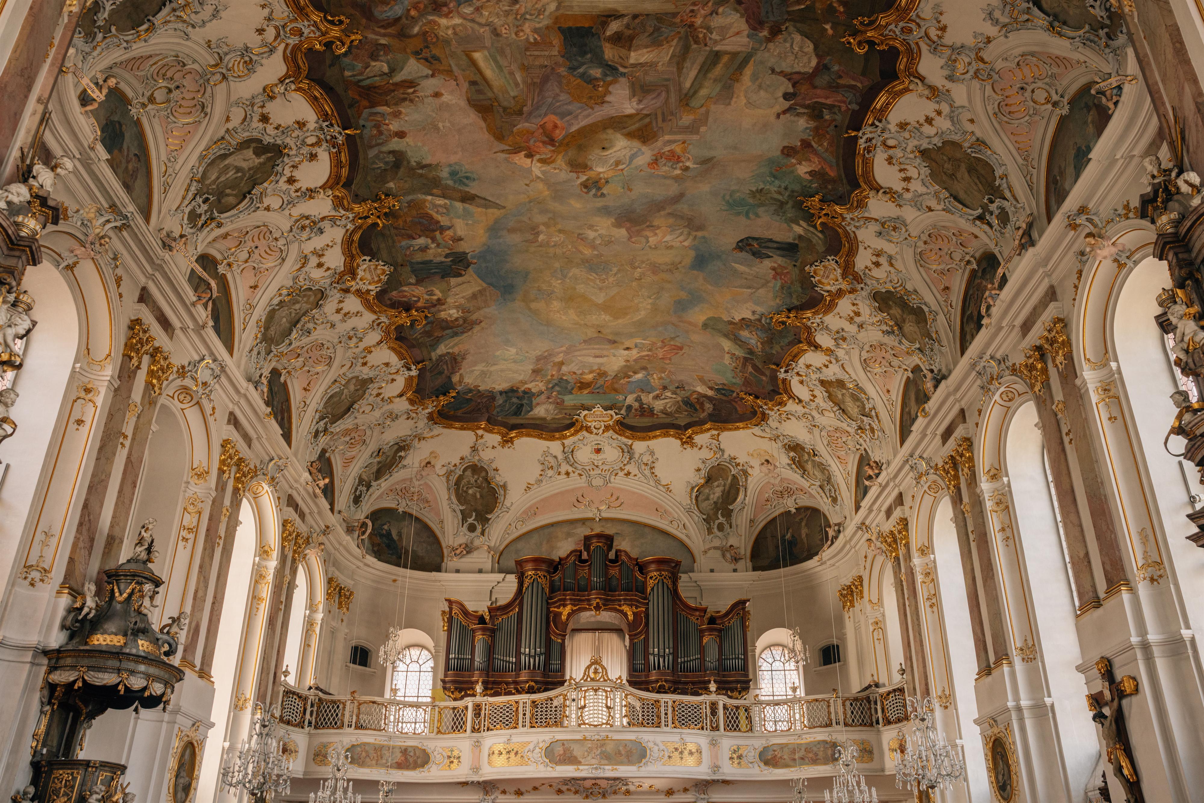 Inside, large, light-filled ceiling frescoes by the painter Johann Baptist Enderle from Donauwörth depict the life of the church father Augustine. The organ with the characteristic central window was built in 1773 by Johann Heinrich Stumm and is one of the few surviving instruments of this renowned organ builder family. Between the southern side altars, there is a linden wood sculpture from the year 1420 in a niche: Mary with the playful child Jesus. With its cheerful expression, it is regarded as an outstanding example of Gothic art of the so-called "soft style." The highly venerated image of grace was rescued from the burning Liebfrauenkirche in 1793. An iconographic peculiarity is finally revealed in the high altar: At the death of Christ, God the Father symbolically has a putto tear the "debt certificate of humanity."