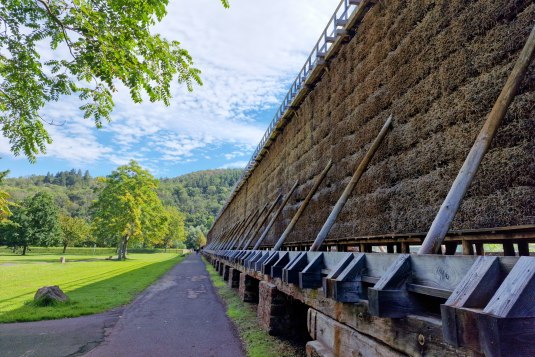 Saline graduation works with a total length of 1.3 km and a height of 9 m are lined up in the Salinental between Bad Kreuznach and Bad Münster am Stein-Ebernburg, providing free breathing and fresh saline air. A walk along Europe's largest open-air inhalatorium not only offers peace and relaxation but also delves into the history of salt extraction in the Nahe Valley. Salt has been extracted here for over 400 years, and the Salinental has become a complete ensemble of salt production, before the healing power of salt springs was discovered in the 19th century and continues to be used today in health and wellness.
