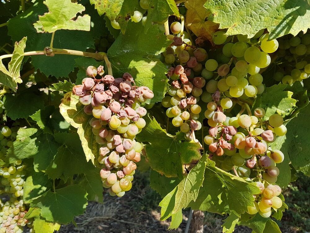 Not only humans need protection from UV rays – our grapes in the vineyards can also get sunburn. Once the berries start to soften, there's a risk that too much sunlight will cause their skin to crack, dry out, and turn blue or brown. Since grapes can’t use sunscreen, winegrowers must take viticultural precautions. As strange as it may sound, early defoliation of the grapes right after flowering is the best way to harden the berry skins. However, on hot summer days, defoliating or thinning out the canopy should be avoided to prevent overexposure to the sun.
