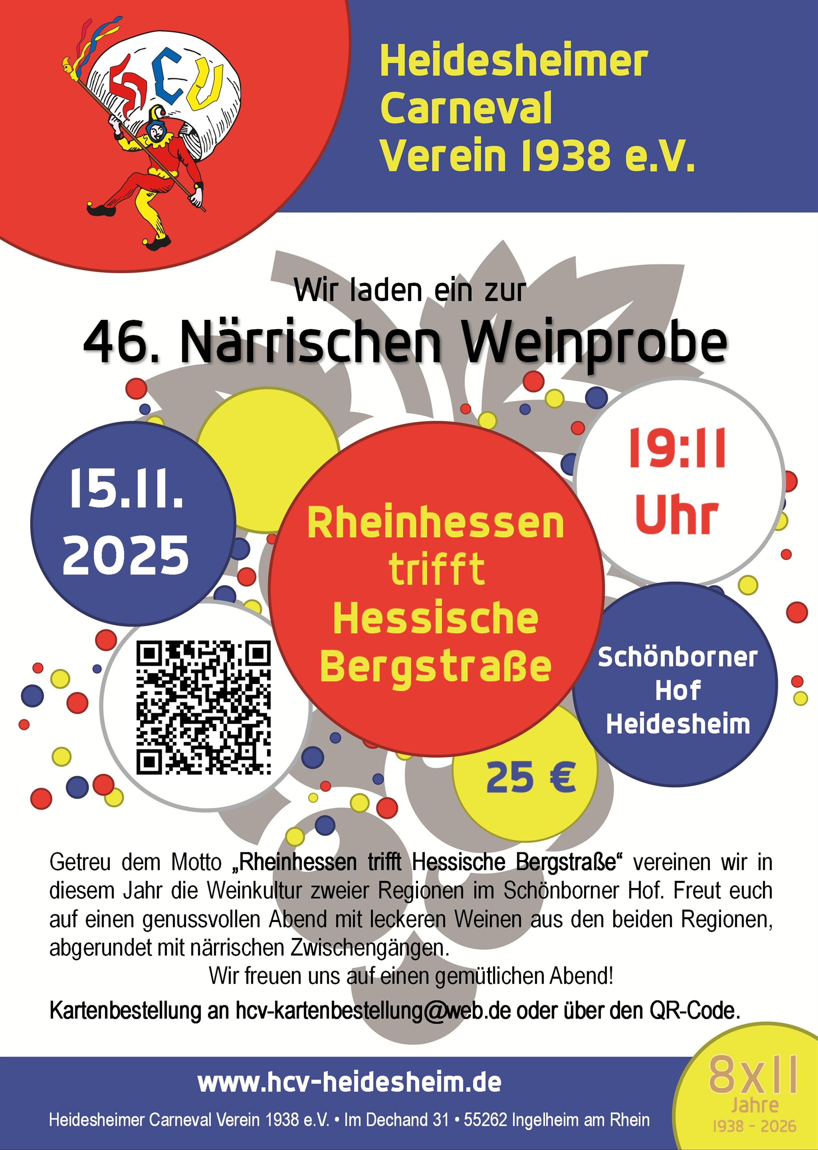 The Heidesheim Carnival Association invites you to the traditional "Foolish Wine Tasting" at the Schönborner Hof in Heidesheim on Saturday, November 15, 2025, at 7:11 p.m. Under the motto "Rheinhessen meets Hessische Bergstraße," guests can look forward to six exciting tasting sessions. Together with Ingelheim Red Wine Queen Laura Schlösser and representatives from both wine regions, the HCV chairman will lead the evening, creating a lively atmosphere and providing interesting background information on the wines presented. This allows visitors to not only enjoy themselves but also discover new things. The participation fee is €25 per person. Tickets can be ordered by email at hcv-kartenbestellung@web.de or via the association's website. Costumes are not required. The HCV looks forward to an enjoyable evening with wine, fun, and conviviality.