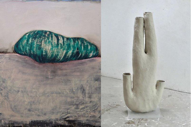 THE TRANSITION is the name of the exhibition by painter Gudrun Emmert and sculptor Anne Haring at the Essenheim Art Forum (February 27 – March 22). Both artists explore the boundary between abstract and representational representation. Gudrun Emmert paints a reality parallel to ours with shapes and colors – inspired by chance finds. For her, the uncertain is the actual subject of the artwork. Sculptor Anne Haring explores the boundary between plastic figure and space, between inside and outside. In her sculptures of human bodies, torsos, and limbs, we find nothing individual, nothing situational. Nothing tells us beyond the material and the volume. And even that she often abstracts further to the raw outline.
