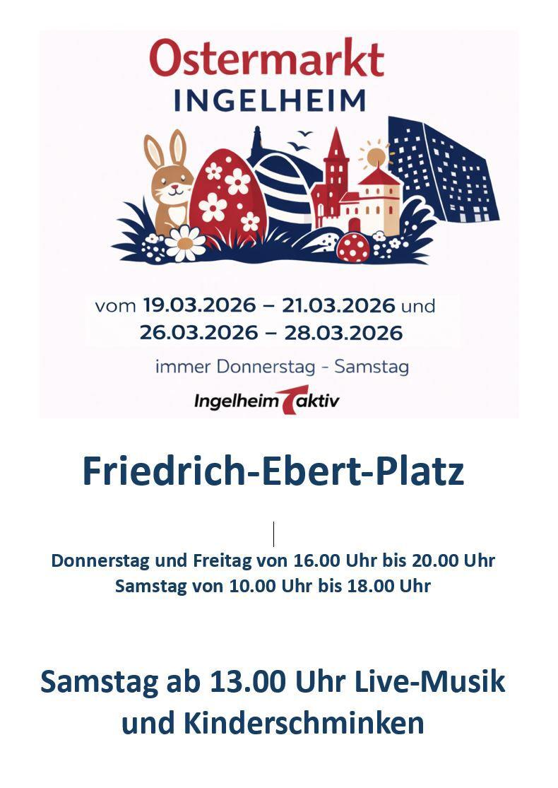 On two weekends from March 19 to March 28, 2026, Friedrich-Ebert-Platz will transform into a pre-Easter paradise. Every Thursday to Saturday, Ingelheim aktiv invites you to stroll and linger.
