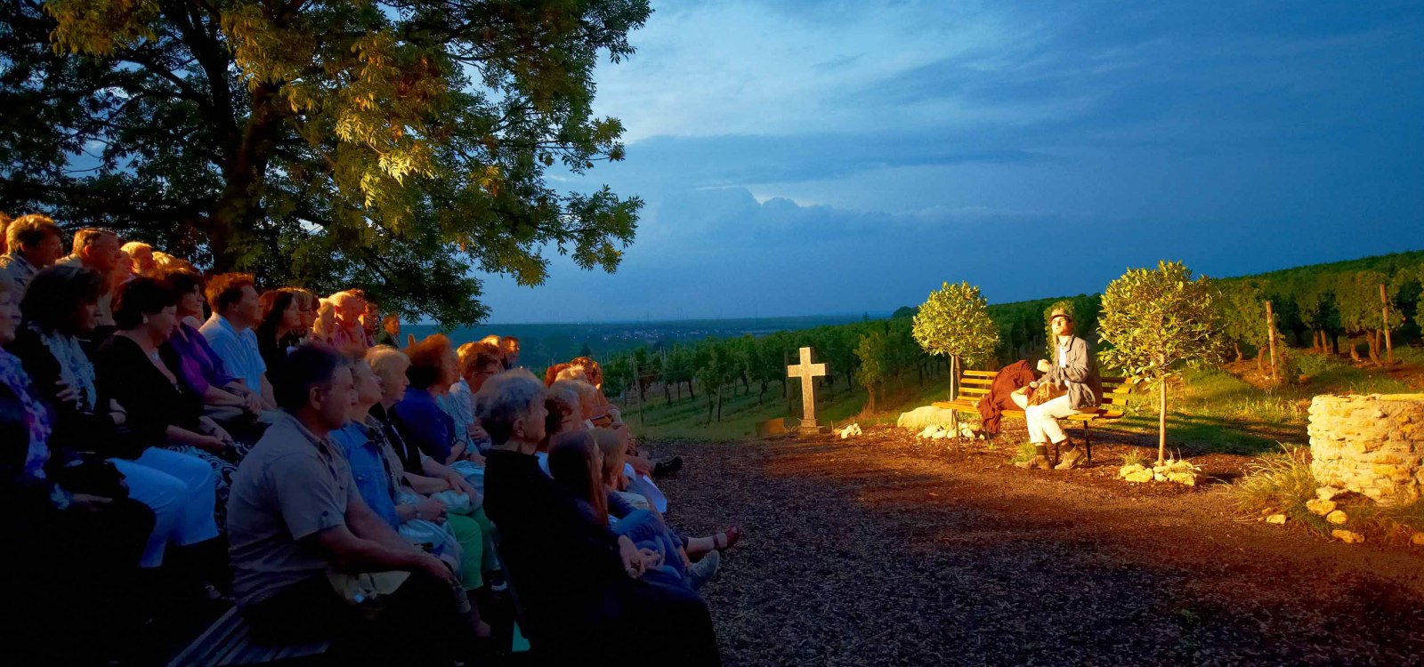 The "Fröhliche Weinberg" is a comedy by the Rheinhessen playwright Carl Zuckmayer. Naturalistic, hearty-colored depiction of Rheinhessen figures, phrases, folk songs and customs. "The comedy is set in Rheinhessen, in the wine autumn Anno twenty-one. It starts in the late afternoon and ends at the second morning "(director's statement by the author).