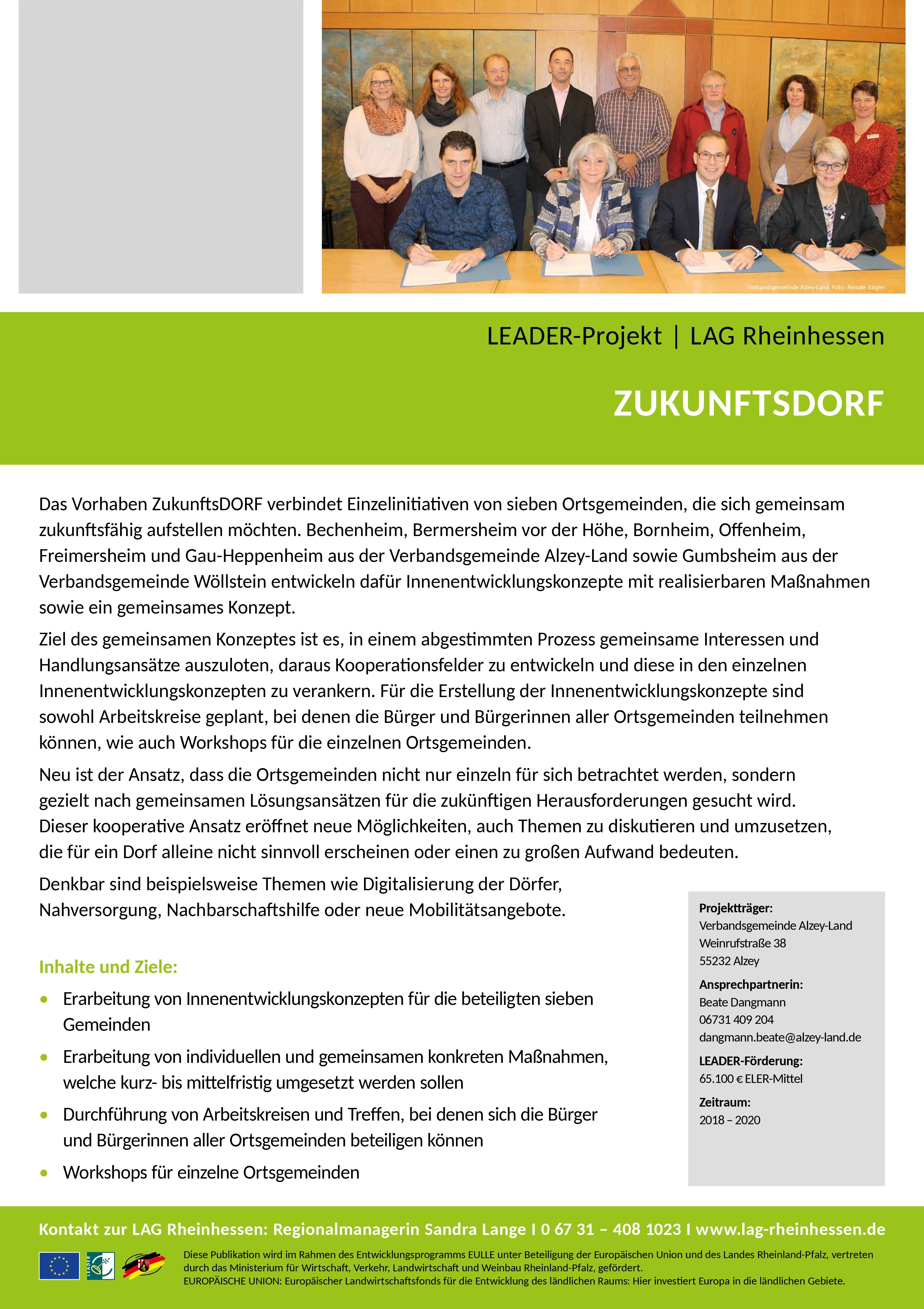 The ZukunftsDORF project combines individual initiatives of seven local communities that wish to set themselves up for the future. Bechenheim, Bermersheim before the height, Bornheim, Offenheim, Freimersheim and Gau-Heppenheim from the Verbandsgemeinde Alzey-Land and Gumbsheim from the municipality Wöllstein develop for internal development concepts with feasible measures and a common concept.