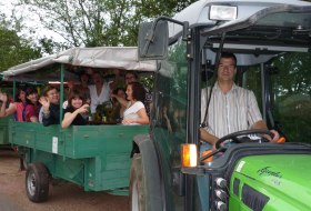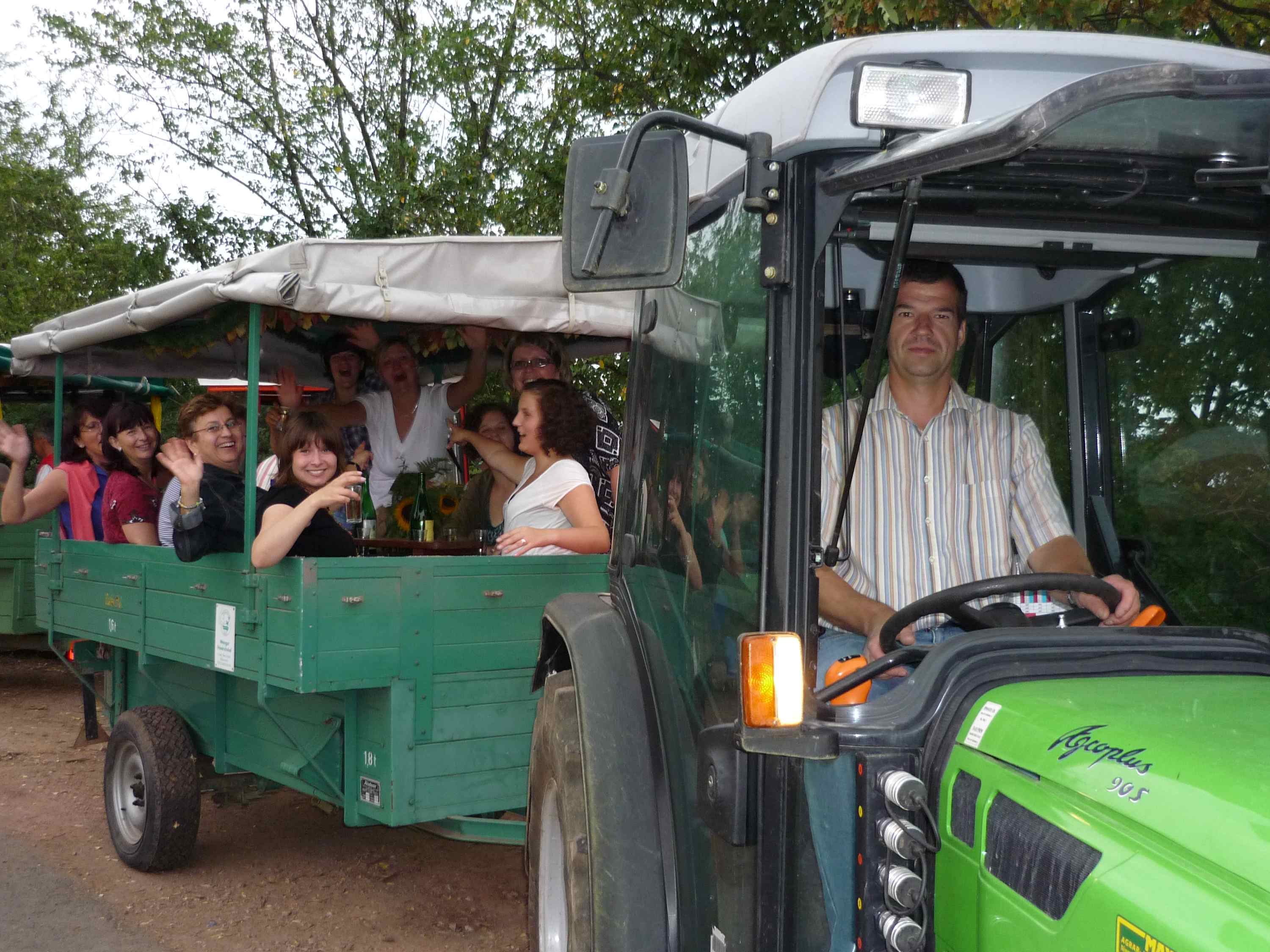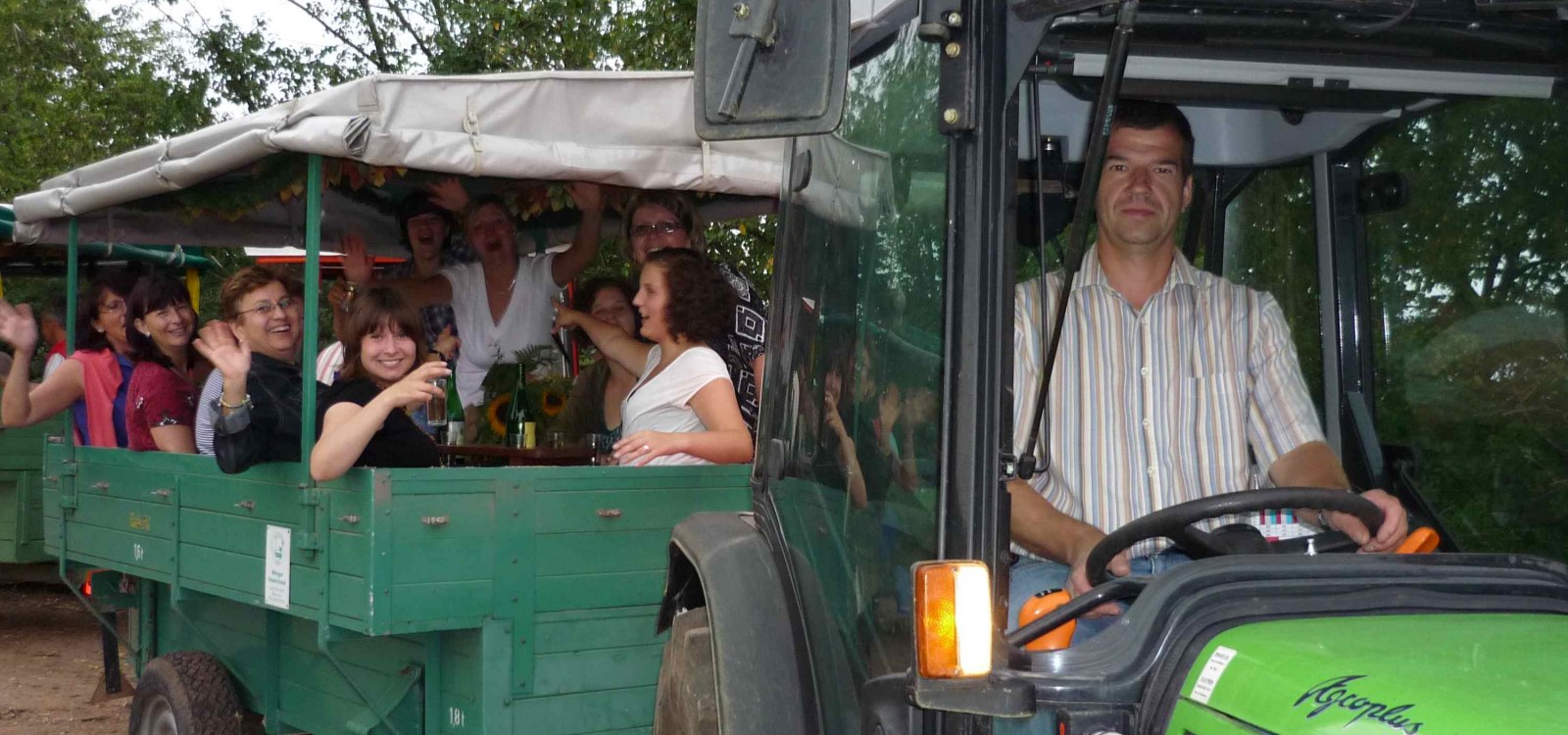 In Rheinhessen, there is aspecial culture of vineyard tours, that is offered bymany winemakers: A "Weinbergsrundfahrt". It is a driving wine tasting. The visitors sit on a covered wagon pulled by a tractor. While taking a tour through the vineyards, they enjoy the classic "Weck, Worscht and Woi" picnic and good Rheinhessen wines, while passing beautiful views and other attractions.