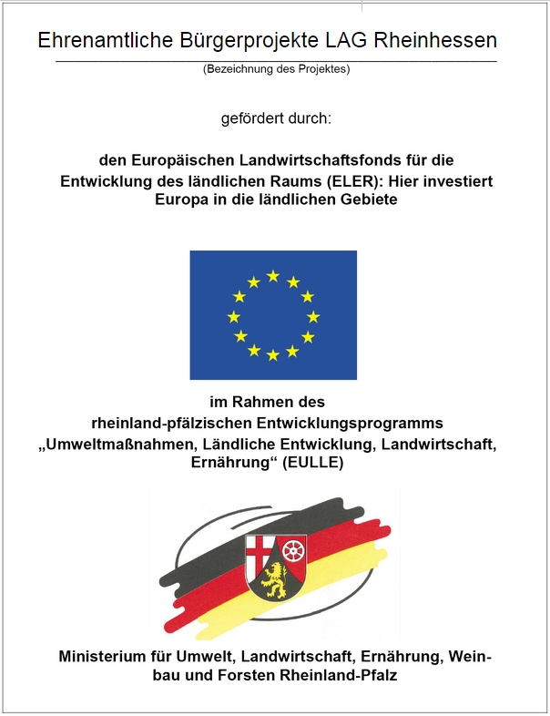 The voluntary citizen projects in the LEADER Rheinhessen region were funded within the scope of the EULLE development program involving the European Union and the state of Rhineland-Palatinate, represented by the Rhineland-Palatinate Ministry of Economic Affairs, Transport, Agriculture and Viticulture.