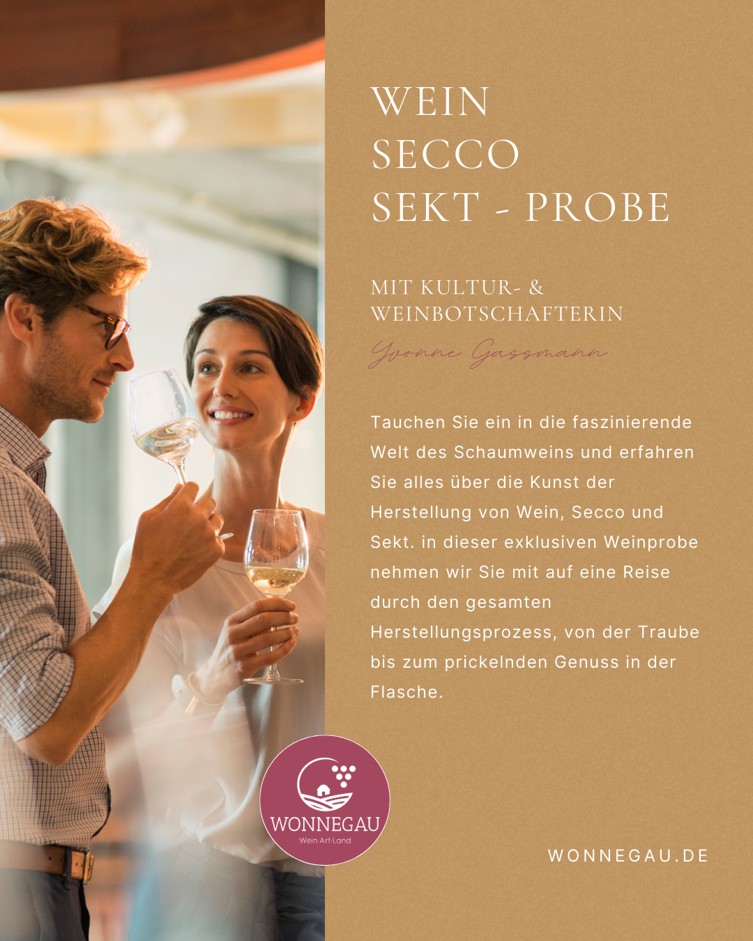 Cultural and wine ambassador Yvonne Gaßmann invites you to a special wine tasting on Wednesday, May 13, 2026, at 6:00 PM at the Tourist Information Wonnegau, Friedrich-Ebert-Straße 31–33, 67574 Osthofen.