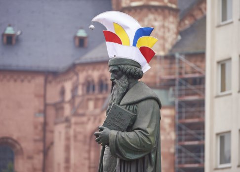 Gutenberg-Denkmal mit Narrenkappe. Fastnacht in Mainz. Copyright: Robert Dieth, @ Robert Dieth