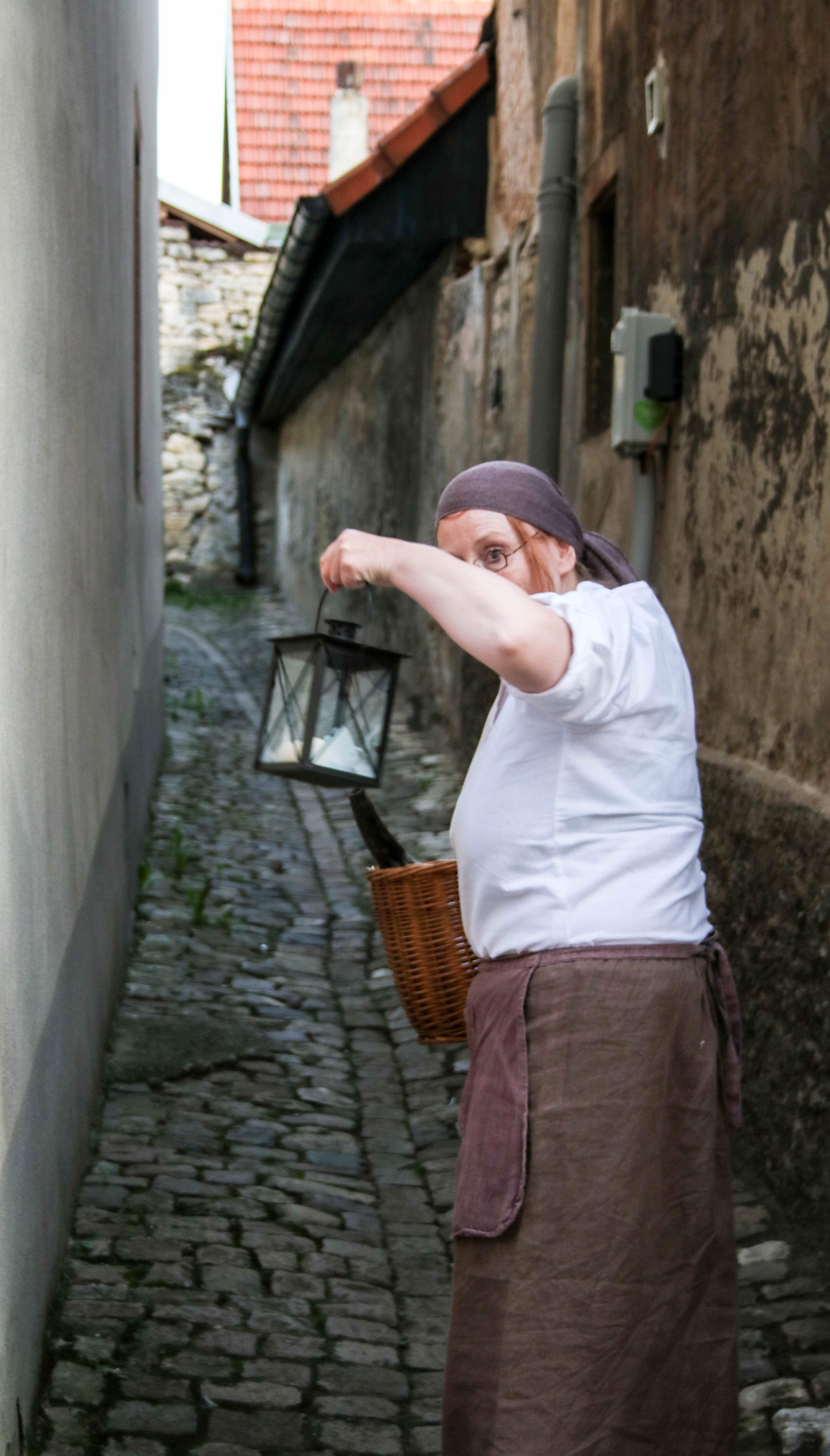 Unsere Reise nach Dalsheim beginnen wir in der Jetztzeit. Als wir aus dem Auto steigen, sind wir aber mitten im Jahr 1860 gelandet. Margret, die Frau des Dalsheimer Nachtwächters kommt uns aufgeregt mit Laterne und Korb entgegen. Schon wieder könne sie ihren Mann nicht finden, es sei doch immer dasselbe! Nun bleibe ihr erneut nichts anderes übrig, als alleine für Ordnung und Nachtruhe der Einwohner zu sorgen. Ob wir sie nicht ein Stündchen begleiten wollten, dann wäre sie nicht so alleine? Wie können wir da Nein sagen.