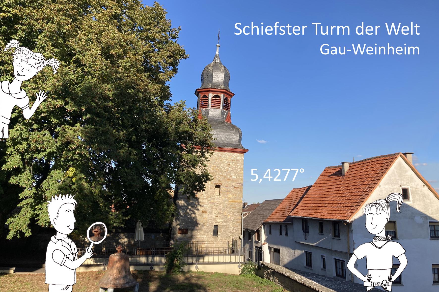 Kommt mit auf Entdeckertour durch das spannende und erlebnisreiche Rheinhessen. Im Mittelpunkt dieser Entdeckertour steht der mit 5,4277° schiefe, aus dem Mittelalter stammende Gau-Weinheimer Glockenturm -ehemalige Wehrturm- "Schiefster Turm der Welt"! Hier lernen die Kinder -aktiv in und mit der Natur- und haben jede Menge Spaß im rheinhessischen Hügelland. Mitzubringen sind wettergerechte Kleidung, ein Rücksack (mit Trinken, Pausenbrot und Detektiv-Utensilien) und Vorfreude auf spannende Erlebnisse.