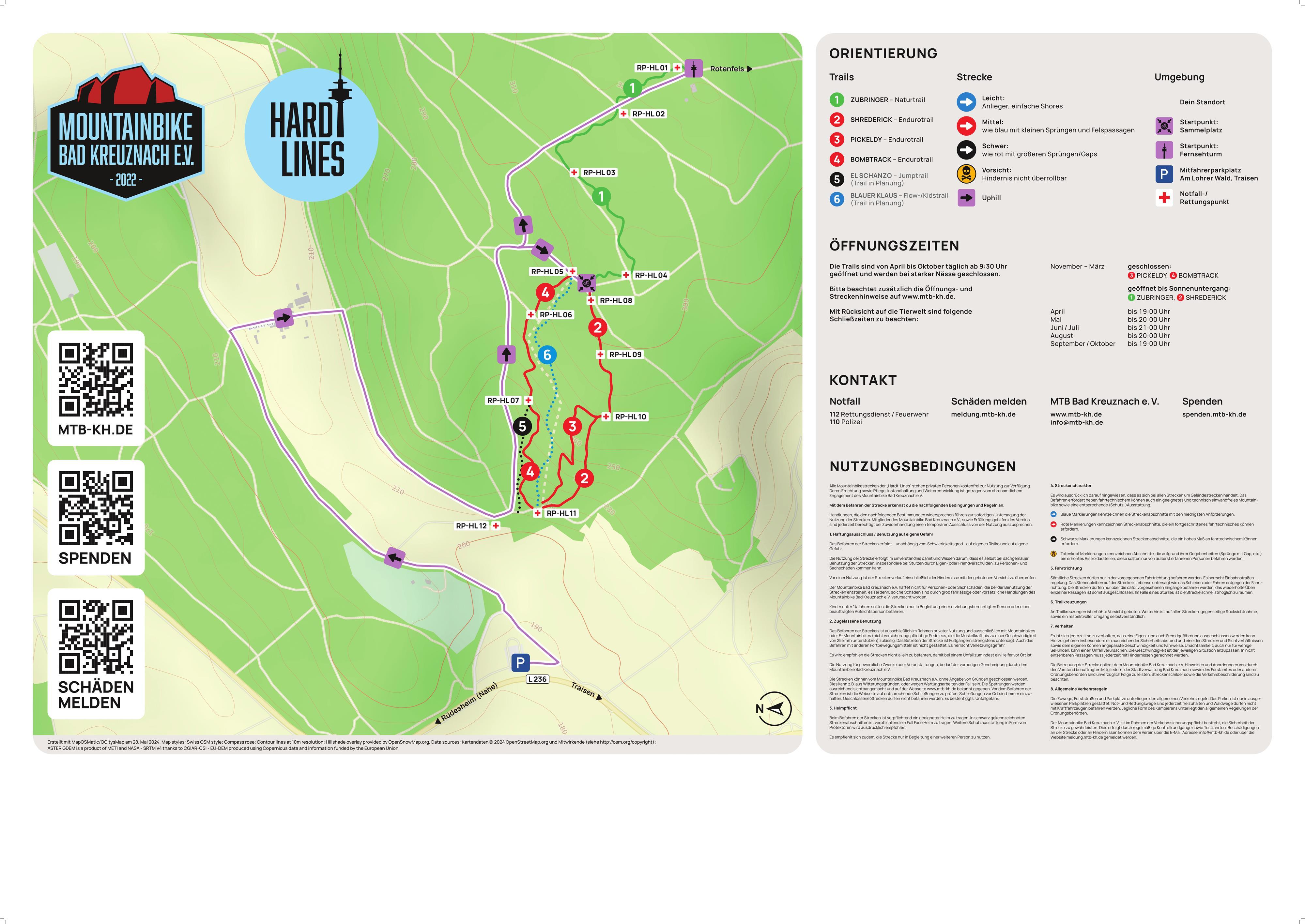 Das Rotenfels-Plateau bei Bad Kreuznach ist eine spektakuläre Naturlandschaft. Rund um einen Fernsehturm hat der örtliche Mountainbike-Club die Hardtlines angelegt. Es ist ein legales, ansprechendes und naturverbundenes Trailnetzwerk. Bombtrack, Pickeldy für Könner und Shrederik für leicht Fortgeschrittene. Anliegerkurven, umfahrbare Sprünge und die natürliche Form des Geländes sorgen für jede Menge Abwechslung. Auf dem Gelände sollen weitere Abfahrten entstehen. Geplant ist ein leichter sowie ein schwerer Trail. Die Anfahrt erfolgt am Besten über den Mitfahrerparkplatz zwischen Rüdesheim/Nahe und Traisen. Hier kann man kostenlos parken.