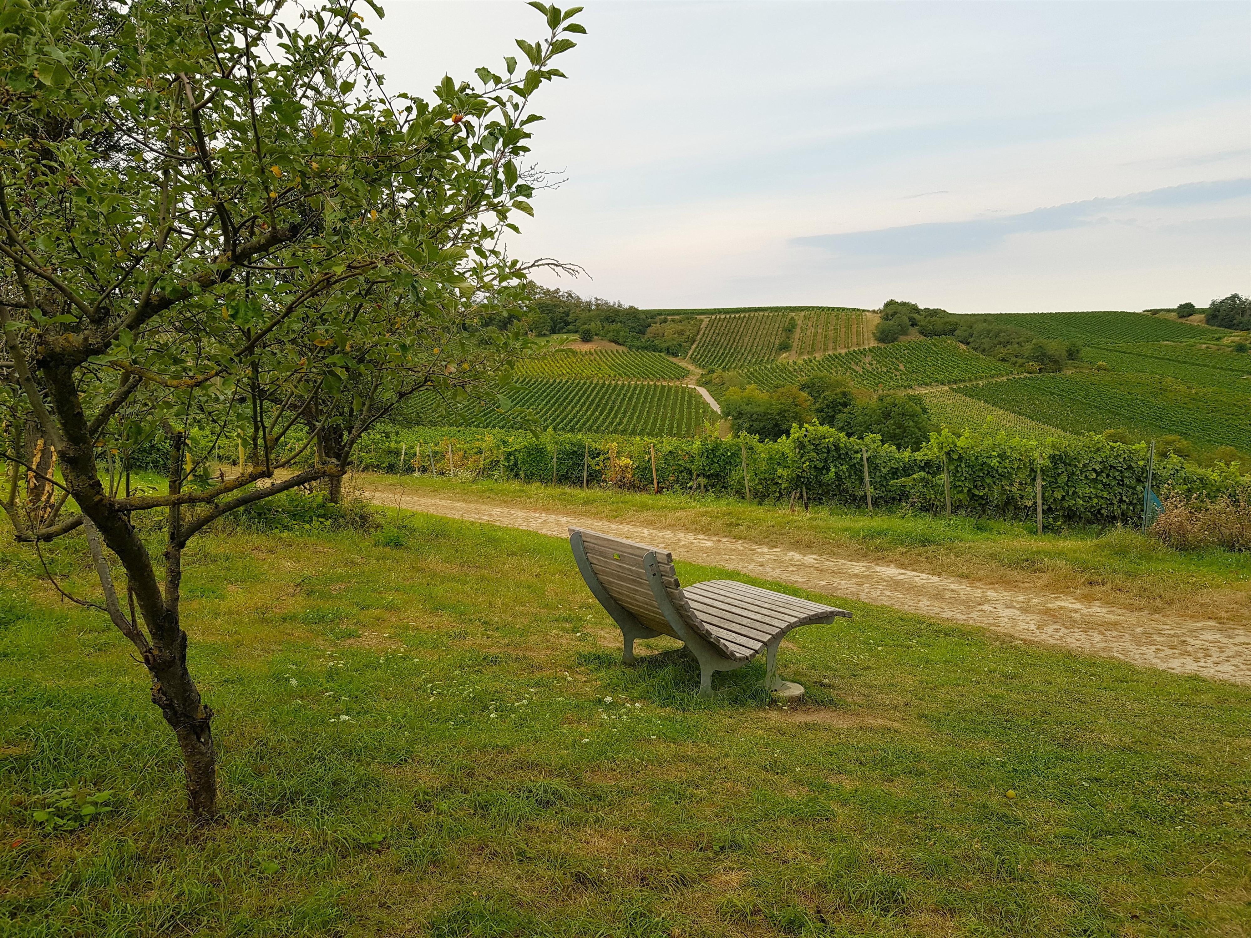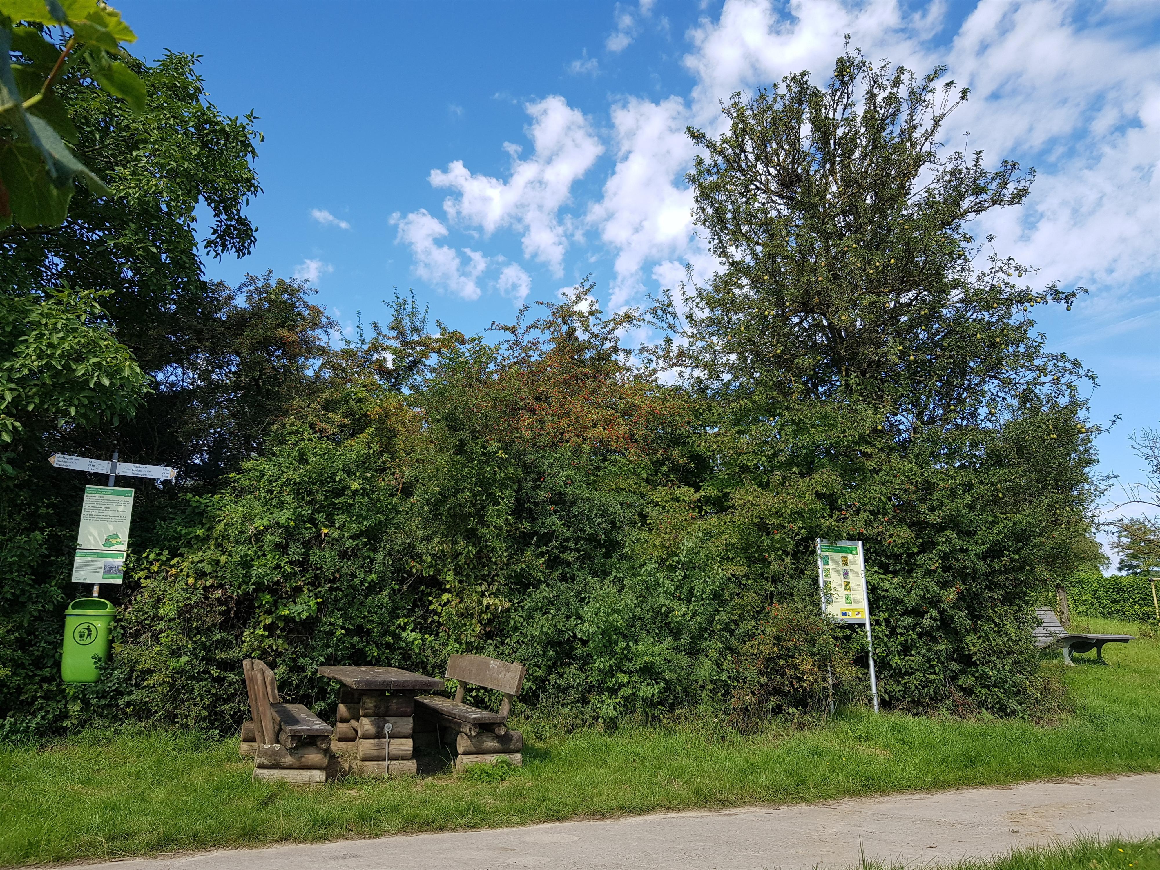 Am Kalmit erwartet Wandernde ein besonders aussichtsreicher Rastplatz inmitten der Natur. Direkt am Wegrand laden ein Tisch mit Bänken zu einer gemütlichen Pause oder Brotzeit ein. Nur wenige Schritte weiter bietet eine Liege auf der Wiese die Möglichkeit, sich auszustrecken und die Ruhe der Umgebung zu genießen. Dabei schweift der Blick in die Ferne über die Landschaft und vermittelt ein Gefühl von Weite und Gelassenheit.