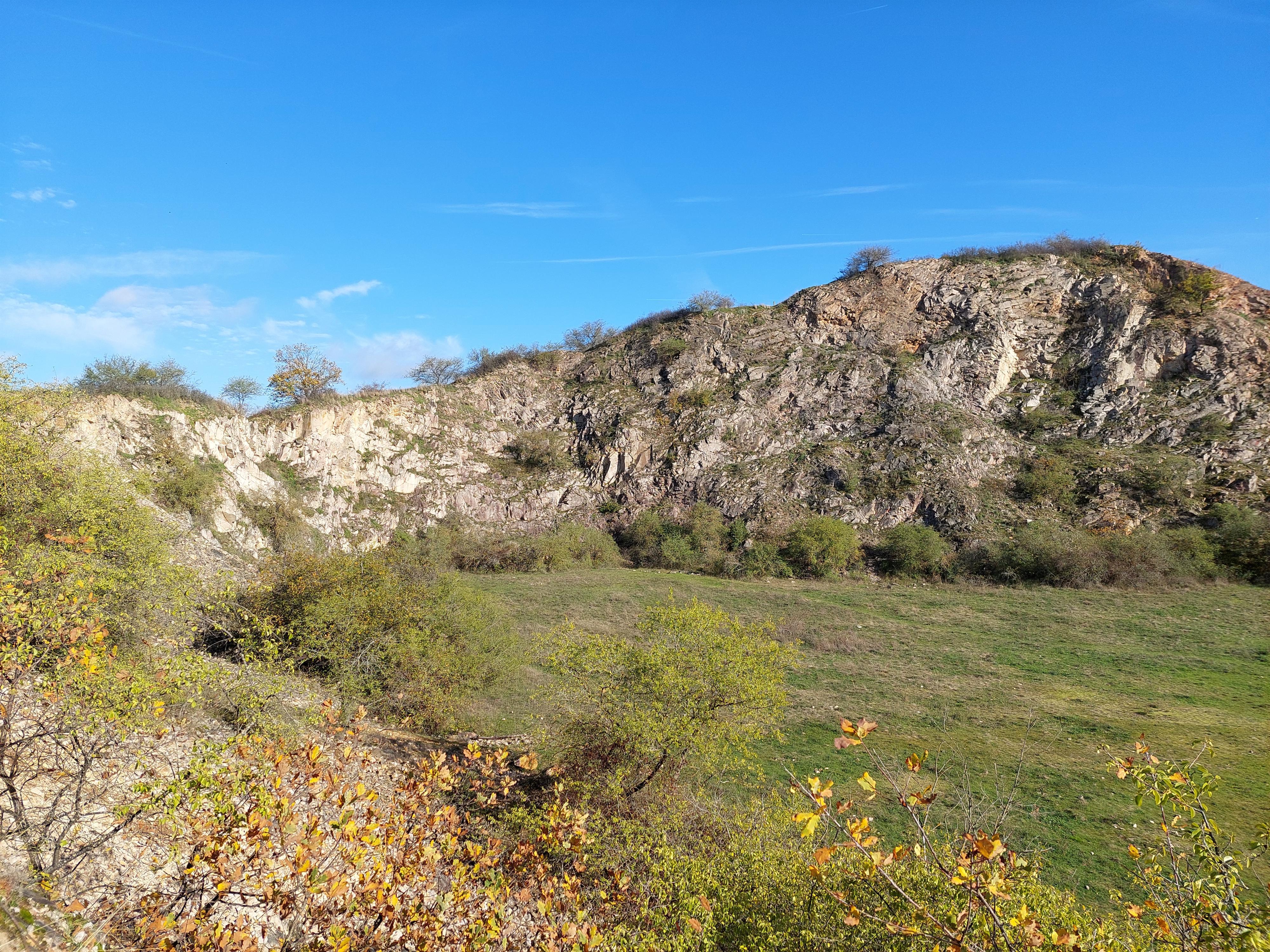 Neben der vielfältigen Tier- und Pflanzenwelt gibt es im Gebiet auch spannende Felsen zu entdecken: Die auffälligen Rhyolith-Formationen im Steinbruch bestehen aus vulkanischem Gestein und zeigen manchmal ein erstaunlich regelmäßiges Muster mit sechseckigen Säulen – ein echter Hingucker.