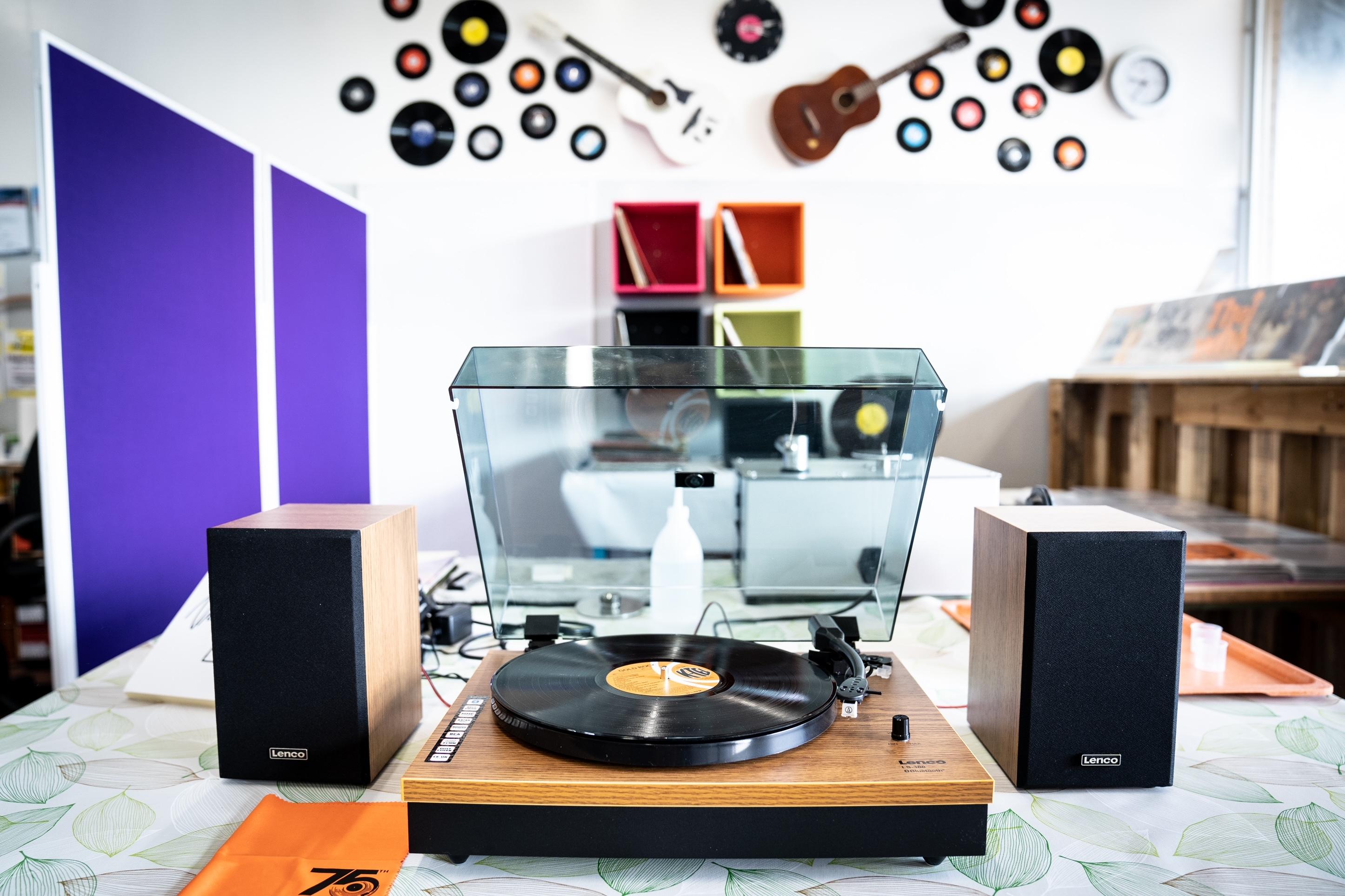 Die Vinylecke unserer Zoar-Werkstatt verkauft vieles rund um das beliebte Vinyl: gebrauchte Schallplatten, Notizbücher und Postkarten aus Schallplatten sowie Coverständer aus Holz.