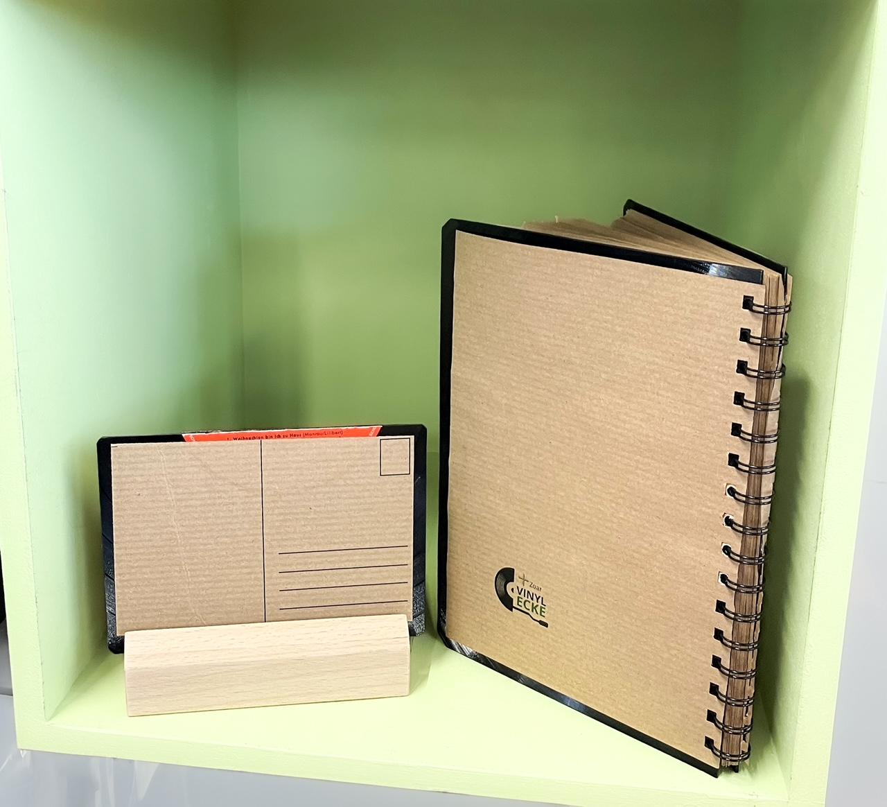 Platten die nicht mehr für den Verkauf geeignet sind werden von unseren Mitarbeitenden zu Notizbüchern und Postkarten weiterverarbeitet.