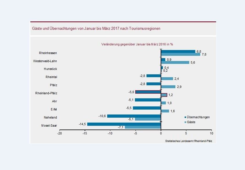 Nach Auskunft des Statistischen Landesamtes wuchs das Übernachtungsvolumen nur in drei von neun rheinland-pfälzischen Tourismusregionen - in Rheinhessen, im Westerwald und im Hunsrück. Im Landesdurchschnitt liegen die Veränderungen bei +1,2% Gästeankünften und - 5,0% Übernachtungen.