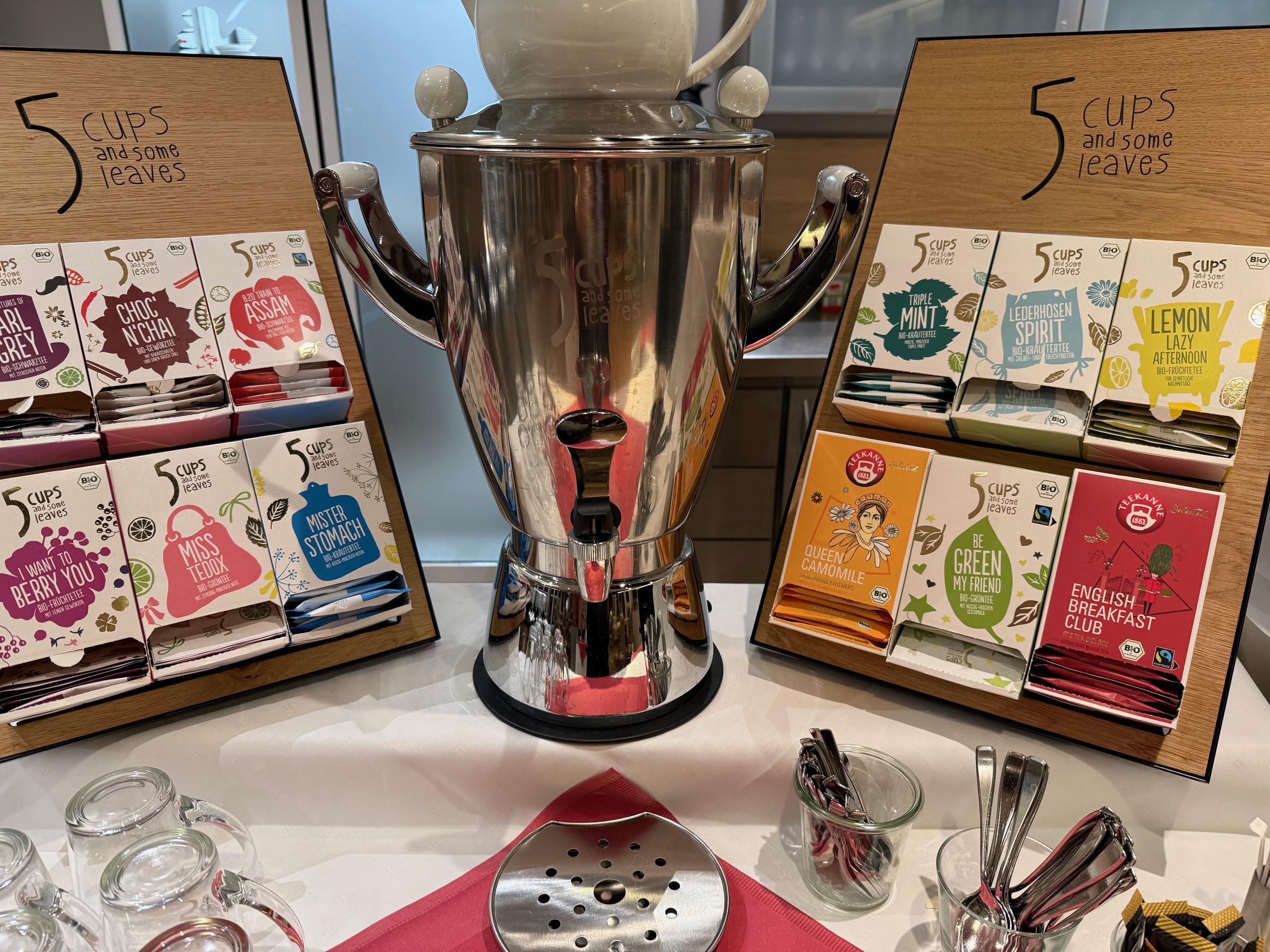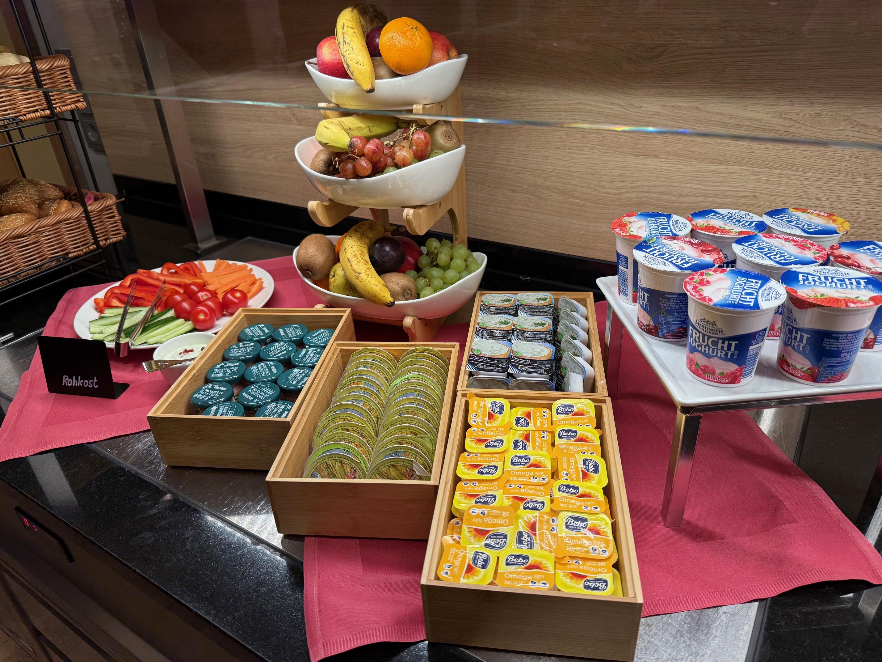 Das Frühstücksbuffet beinhaltet: ein gemischtes Brötchensortiment Waffelstation verschiedene Wurst- und Käseaufschnitte verschiedene Brotaufstriche (wie zum Beispiel Frischkäse, Leberwurst, Margarine, Butter, vegane aufstriche) Marmeladen, Honig ,Nutella Frisches Obst, Obstsalat und Gemüse verschiedene Eierspeisen verschiedene Cerealien Fruchtsäfte von Granini , Selzer Wasser Still und Classic Kaffeespezialitäten von "Heimbs" und diverse Teesorten von "Teekanne"zur Selbstbedienung Natur- und Früchtejoghurt