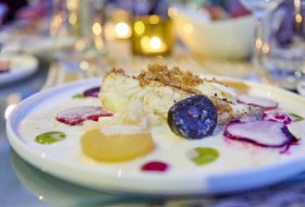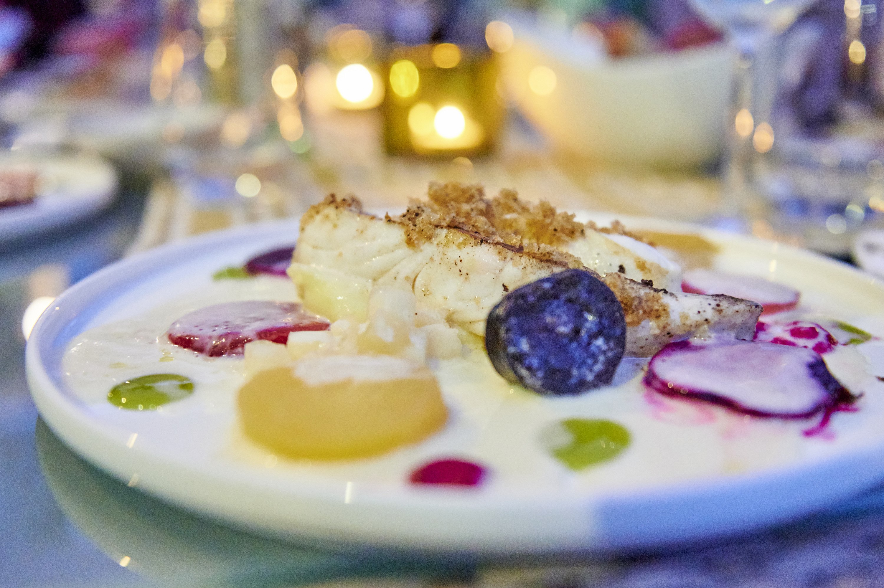 Heilbutt auf Kartoffelstampf mit Blutwurst, bunter Beete und karamellisiertem Apfel.