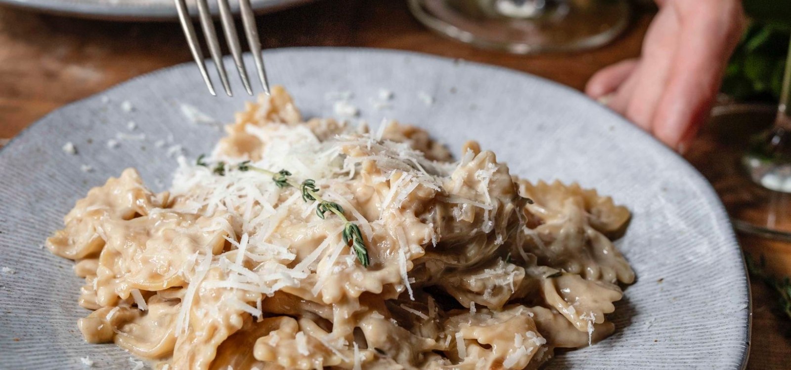 Sobald die Zwiebeln gar sind, Crema all’Aceto unterrühen und die Bouillon dazugeben. Jetzt folgen die Farfalle. Diese für 12 – 15 Min. bei geschlossenem Deckel köcheln bzw. bis sie al dente sind. Zuletzt die Sahne hinzugeben.