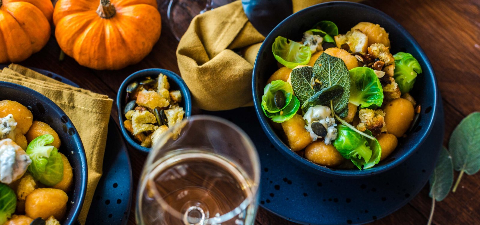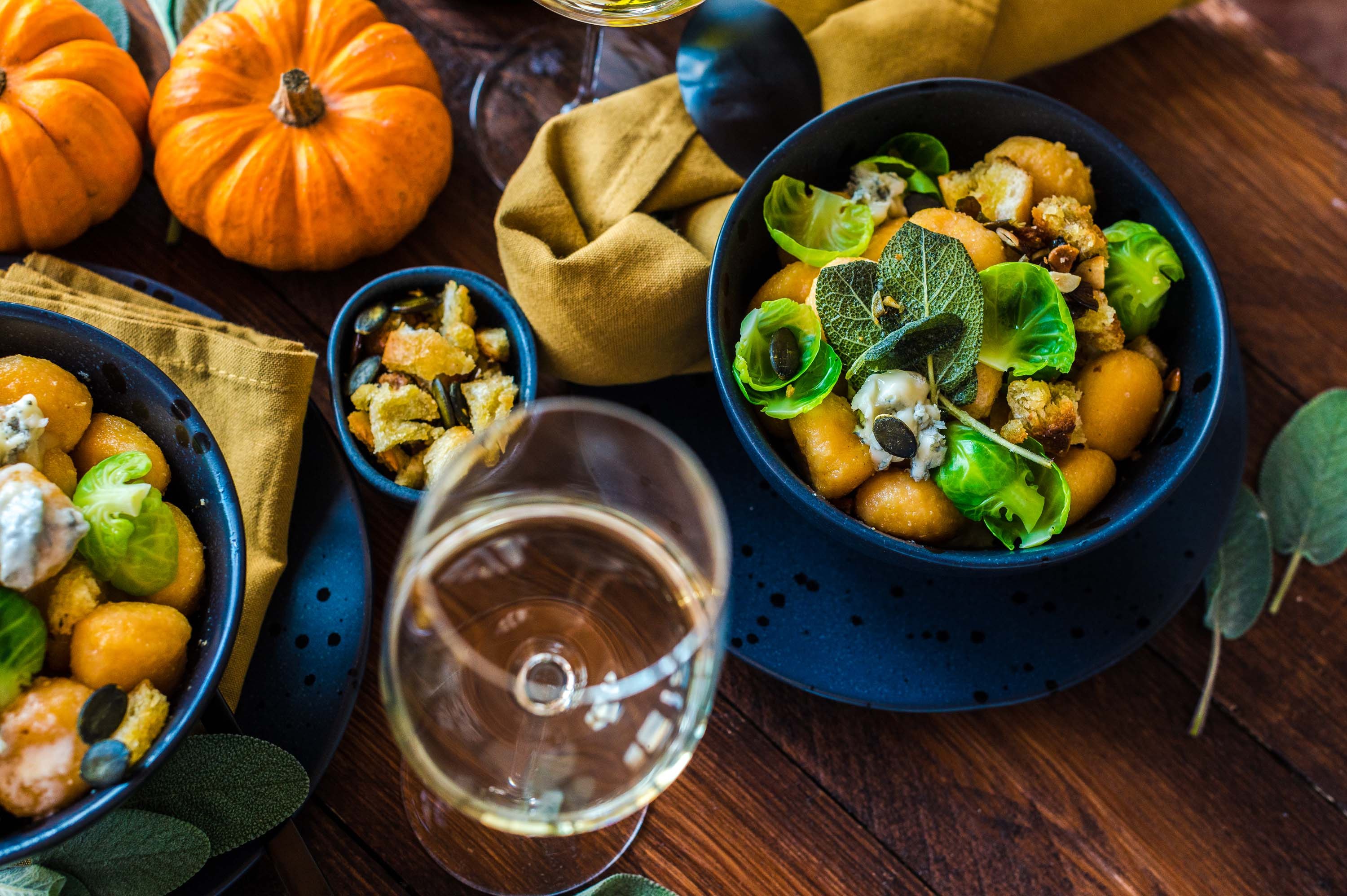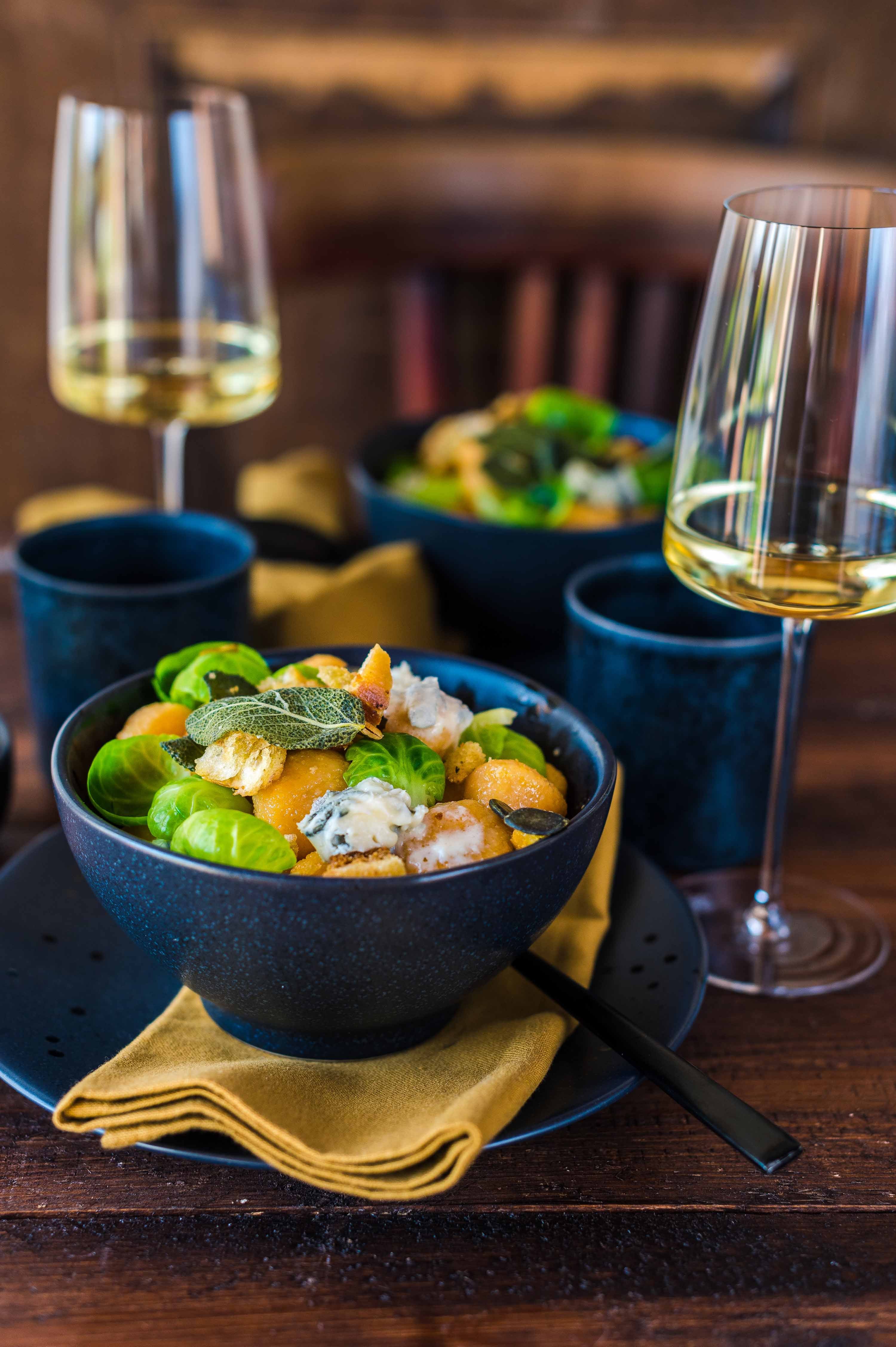 Der Herbst bringt die schönsten Farben hervor. Endlich wird es goldgelb und auch das Licht ist ein ganz Besonderes. Aus diesem Grund haben wir heute versucht, diese wunderschöne Stimmung auf einem Teller einzufangen. Diese orangenen Kürbis-Gnocchi mit Knuspercrunch und Gorgonzola-Creme sind nicht nur lecker, sondern ein ganz besonders köstlicher Gaumenschmaus! Dazu gibt es als herben Gegenspieler und farblichen Kontrast frittierte Rosenkohl-Chips, diese sind nicht nur ein echter Hingucker, sondern runden dieses vegetarische Gericht einfach perfekt ab. Und in Butter ausgelassener und knusprig angebratener Salbei ist sowieso der ultimative Tipp für alle Gnocchi-Gerichte. Kartoffeln, Kürbis und Salbei sind ein wunderbares Trio, welches gerne noch um weitere Aromen ergänzt werden kann.