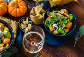 - Vor dem Servieren der Gnocchi die Sauce darauf zusammen mit dem knusprigen Brot und den Kürbiskernen verteilen.