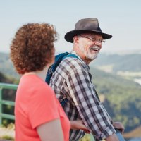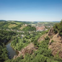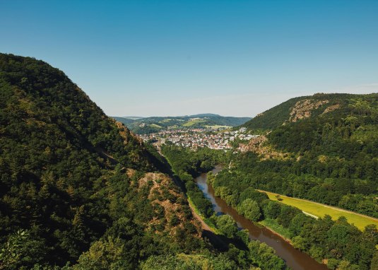 Von einem schönen Aussichtspunkt unweit dem Schloss Rheingrafenstein blickt man aus 320 Metern Höhe über den Stadtteil Bad Münster am Stein-Ebernburg hinweg weit in das Nahetal.