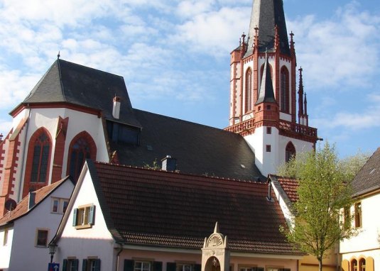 Die Kirche ist zum Wahrzeichen der Gegend geworden. Von der Bedeutung des Ortes, der einst Stadtrechte besaß, kündet schon von weitem der über 60 m hohe Turm. Die dreischiffige Kirche wurde innerhalb kurzer Zeit zwischen 1431 und etwa 1475 errichtet. Ihre Stifter waren der letzte Graf von Veldenz und sein Schwiegersohn, der mit dem Haus Simmern-Zweibrücken eine neue Linie der Wittelsbacher begründete. Die an prominenter Stelle über dem Eingang angebrachte Gründungstafel (zwei Engel mit Kelch) erinnert außerdem an die im 15. Jahrhundert blühende Wallfahrt zum Heiligen Blut. Drei verschiedene Baumeister haben den Bau geprägt, der sich zu einem harmonischen Gesamtbild fügt. Der hohe, komplett durchfensterte Chor, mit dem begonnen wurde, zeigt Verwandtschaft zu den Bauten Madern Gertheners. Das kurze, breite Langhaus, das als gestufte Halle Teile des Vorgängerbaus mit einbezieht, weist auf einen niederrheinischen Meister. Der neben der Stadtmauer gelegene, festungsartige Turm mit elegantem Abschluss wird Nikolaus Eseler zugeschrieben (Quelle: Liebfrauenland - Gotik in Rheinhessen)