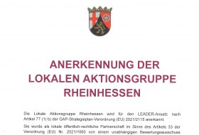 Die Lokale Aktionsgruppe (LAG) Rheinhessen ist am 8. November 2022 offiziell als LEADER-Region für den Förderzeitraum 2023 anerkannt worden. Staatssekretär Andy Becht überreichte im Rahmen einer Feierstunde im Hambacher Schloss in Neustadt an der Weinstraße die Anerkennungsurkunde. Damit gehört die LAG Rheinhessen zu einer der 21 rheinland-pfälzischen LEADER-Regionen, die mit EU-Mitteln den ländlichen Raum weiterentwickeln können. Für die nächsten sieben Jahre stehen der LEADER Region Rheinhessen insgesamt vier Millionen Euro ELER-Mittel (Europäischer Landwirtschaftsfonds für die Entwicklung des ländlichen Raums) sowie 500.000 Euro Landesmittel und 500.000 Euro GAK-Mittel (Gemeinschaftsaufgabe Verbesserung der Agrarstruktur und des Küstenschutzes) für die, unter Beteiligung der Öffentlichkeit erarbeitete, Entwicklungsstrategie (LILE) zur Verfügung.