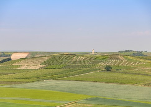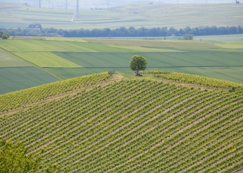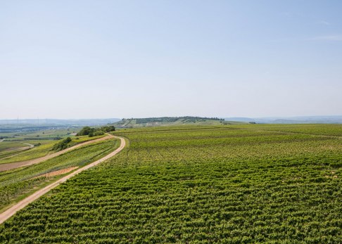 Unser nächstes Ziel, der Vendersheimer Weinbergsturm, ist in der Ferne schon erkennbar. Bis dahin geht es erst einmal noch eine ganze Weile auf und ab. Dank E-Bike kein Problem! Wir lassen uns den Fahrtwind um die Nase wehen und halten auf etwa halber Strecke zwischen Sulzheim und Vendersheim erneut an.