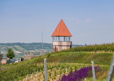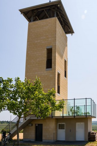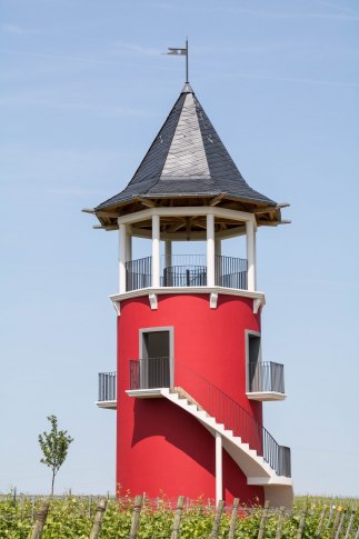 Der dritte und letzte Turm unserer E-Bike-Tour strahlt uns schon von Weitem entgegen. Und zwar in einem leuchtenden Burgunder-Rot. Zum letzten Mal klettern wir die Stufen hinauf und werden auch auf dem Wörrstädter Burgunderturm mit einem tollen Ausblick belohnt.
