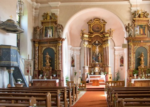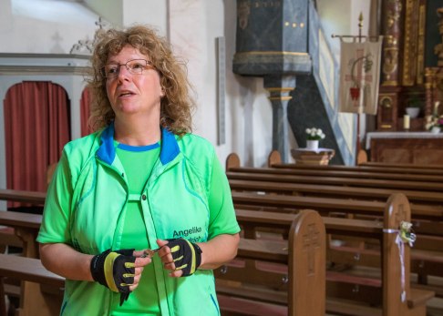 Nach einer kurzen Einweisung in die Funktionsweise der Räder geht es direkt los, zunächst ins benachbarte Sulzheim. Wir halten vor der kleinen Barockkirche St. Philippus und Jakobus, in die wir einen Blick hineinwerfen. Sie wird sowohl katholisch als auch evangelisch genutzt, und Angelika Friedrich erzählt augenzwinkernd, dass manche Sulzheimer zu beiden Gottesdiensten gehen, damit sie nichts verpassen.