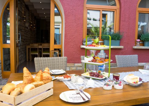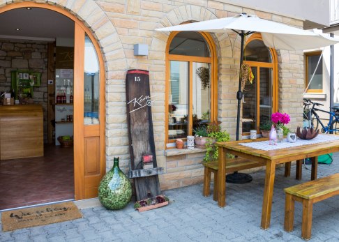 Wenn man es wünscht, bringt Familie Kern die Stärkung auch zum Tisch des Weines an den Weinbergsturm. Wir sind aber sehr froh, das herzliche Ambiente des Weinguts kennengelernt zu haben. Wir kommen wieder! Das nächste Mal dann ohne E-Bike zur Weinprobe.