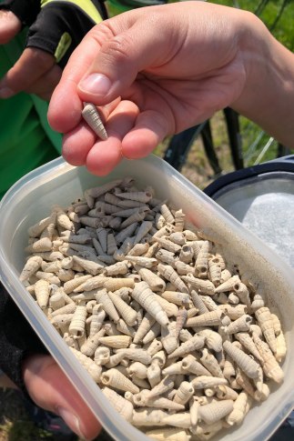 Doch warum in die Ferne schweifen, wenn das Nahe noch beeindruckender ist? Wir erfahren, dass der Ur-Rhein vor 10 Millionen Jahren mitten durch das Wörrstädter Land führte. Und dann holt unsere Tourenleiterin eine kleine Dose aus ihrer Tasche. Sie ist bis oben hin mit 30 Millionen Jahre alten Urmeer-Muscheln gefüllt, die sie selbst ganz in der Nähe gesammelt hat. Die kalkigen Schalen sind ziemlich trocken, die Art und Weise mit der Angelika Friedrich uns Millionen Jahre Geschichte vermittelt, ist alles andere als das!