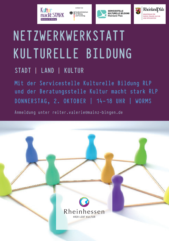 Ursprünglich sollte die NetzwerkWerkstatt Kulturelle Bildung: Stadt-Land-Kultur in Zusammenarbeit mit der Servicestelle Kulturelle Bildung Rheinland-Pfalz und der Beratungsstelle Kultur macht stark Rheinland-Pfalz am 27. August stattfinden. Diese mussten wir krankheitsbedingt verschieben.