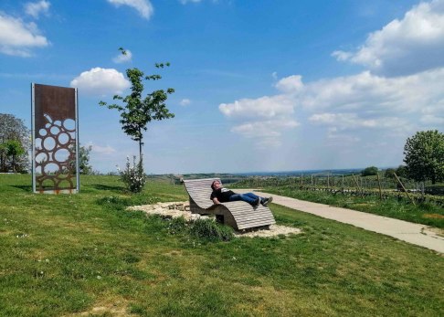 Ich genieße die fröhliche, lebhafte Atmosphäre und lasse den Blick über die Landschaft schweifen: Malerische Weinberge und Wiesen, soweit das Auge reicht. Etwas unterhalb des Pavillons lädt eine großzügige Wanderliege zum Entspannen ein.