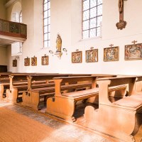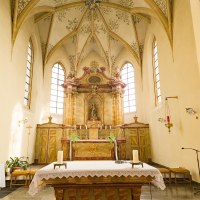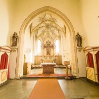 Het koor, gebouwd in 1517, is bewaard gebleven van de oudere kerk, waarvan de zogenaamde "luchtribben" als decoratieve elementen naar buiten groeien.