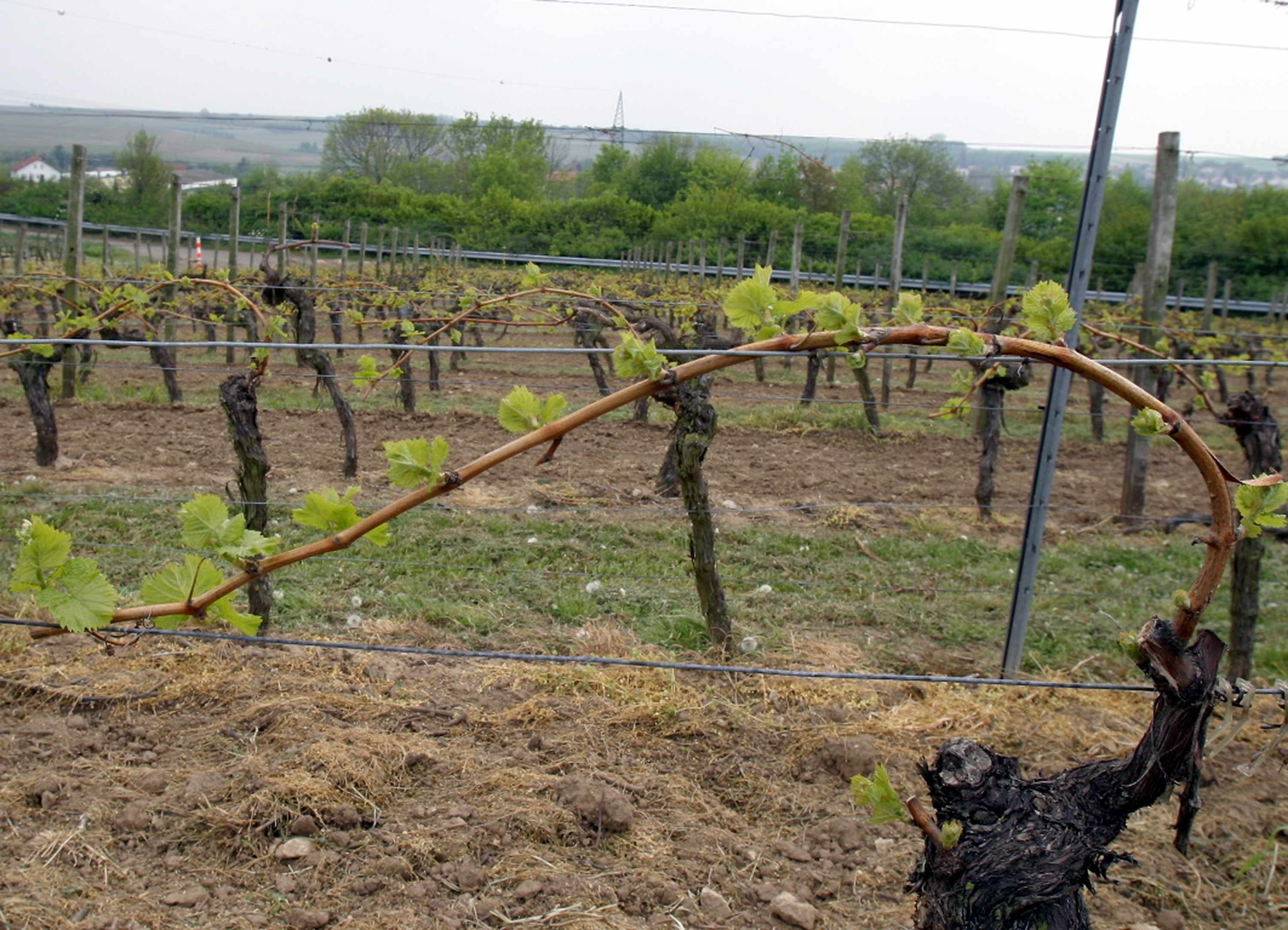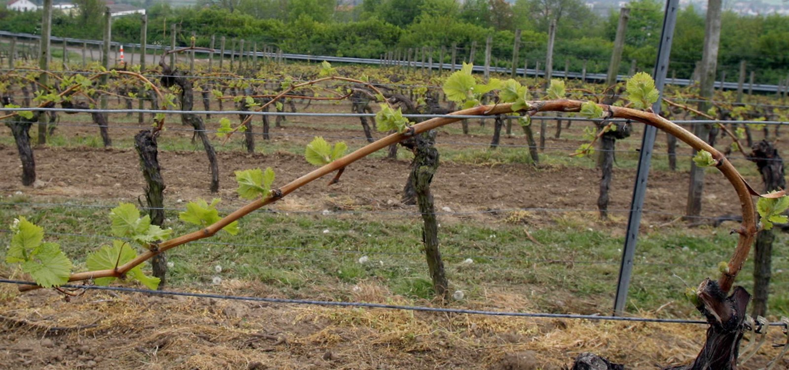 Een deel van het wijnstokwerk. Het volgt het snijden van de wijnstokken en bestaat uit het opzij buigen van de resterende wijnstokken (het vruchthout) en ze in één keer aan de wingertdraad vastbinden.
