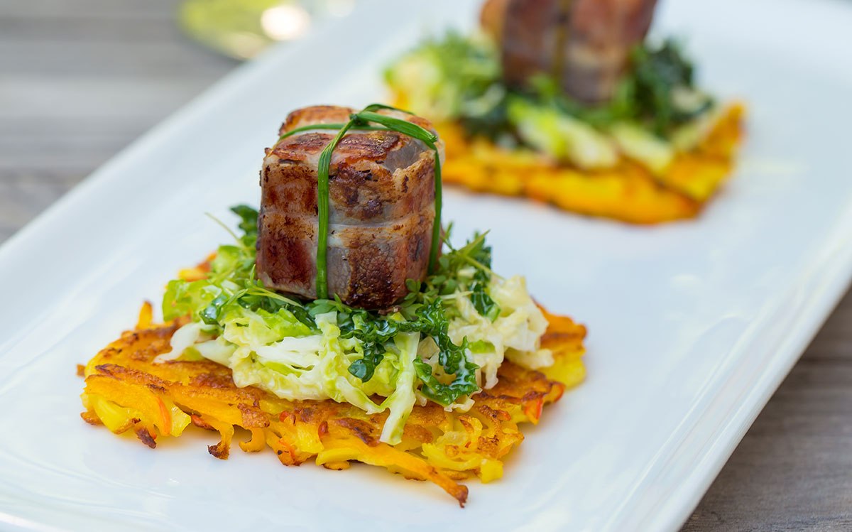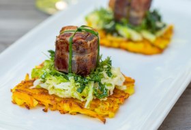 Snijd de bloedworst in zo groot mogelijke blokjes, bestrijk ze met Riesling-mosterd en wikkel met het spek. Blancheer de bieslook enkele seconden in kokend water en spoel af met koud water. Bind de zakjes bloedworst met de bieslook als een cadeautje en bak ze aan alle zes de kanten krokant bruin.