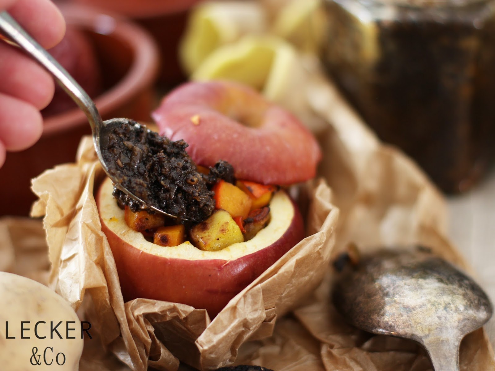 Vul nu je appels met de groenten en bak ze ongeveer 25 minuten in de oven op 160 ° C. Leg vervolgens de bloedworstjam op tafel zodat deze kan worden "gekruid".