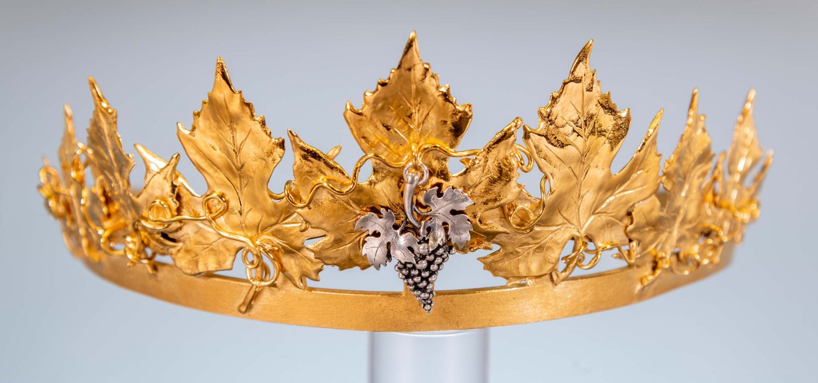 Het wijnblad-arrangement wordt met de hand op de ring gesoldeerd met een open vlam (650 - 700 ° C). Het soldeerproces wordt meerdere keren herhaald om de duurzaamheid van de messen te optimaliseren en eventuele zwakke punten te verwijderen. De geassembleerde kroon krijgt vervolgens het definitieve oppervlak, de hoepel wordt gematteerd en de bladeren worden gepolijst om het contrast tussen de elementen te versterken. Ten slotte is de Crown of Majesties galvanisch verguld en is het oppervlak dus verzegeld.