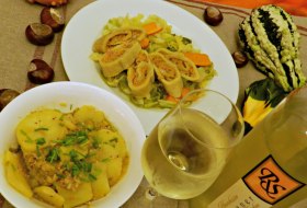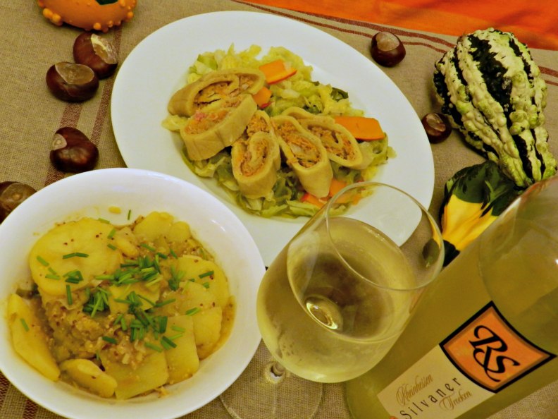 Maultaschen met pompoen- en kalfsworstvulling, met aardappelsalade met prei en Rieslingmosterd en savooiekool met pompoen en wijngelei
