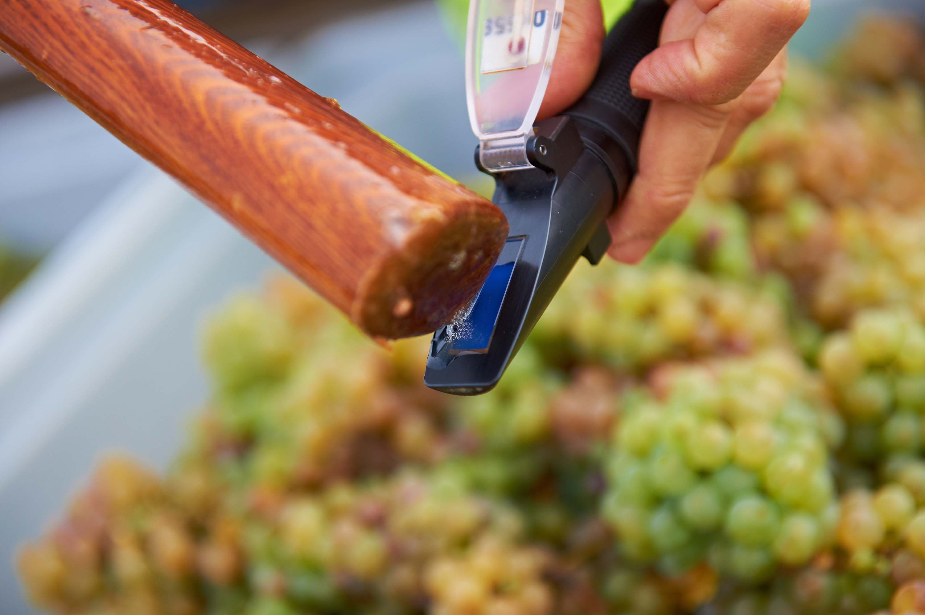 Optisch, telescoopachtig apparaat voor het bepalen van het mostgewicht van rijpende druiven in de Wingert. De breking van licht wordt gemeten en het suikergehalte wordt afgelezen op een meetschaal.